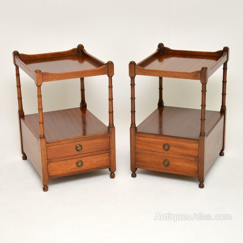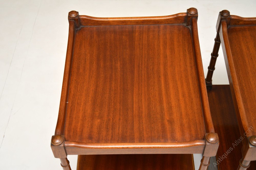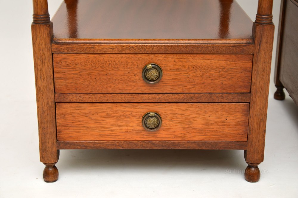 Pair of antique George III style mahogany two tiered side antique tables, ideal as lamp antique tables either side of a sofa. They are in excellent condition, having just been French polished & date from around the 1950’s period. These tables are free standing with polished backs & have two drawers on each.