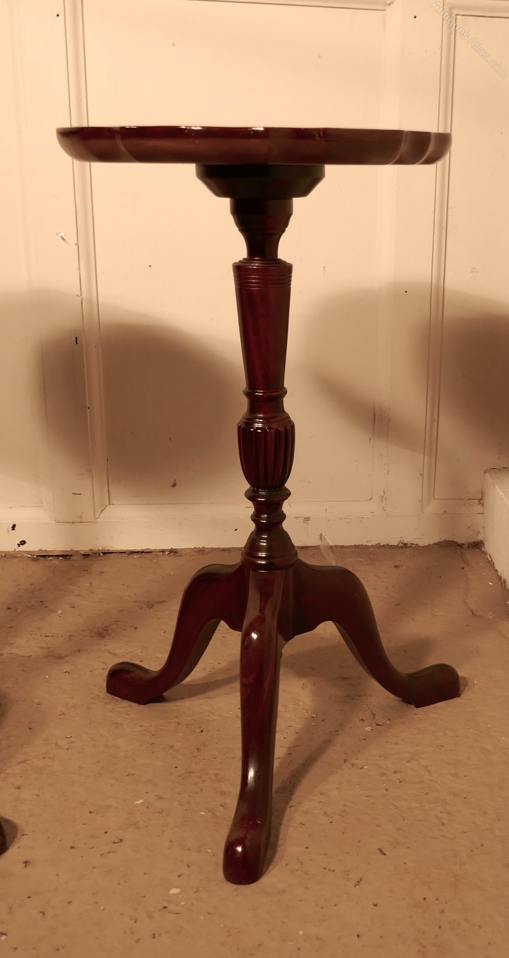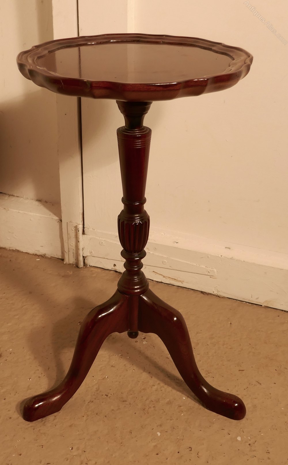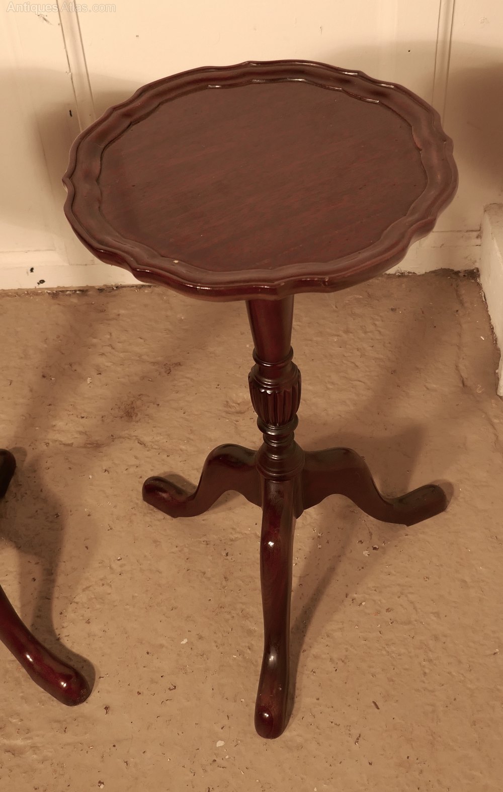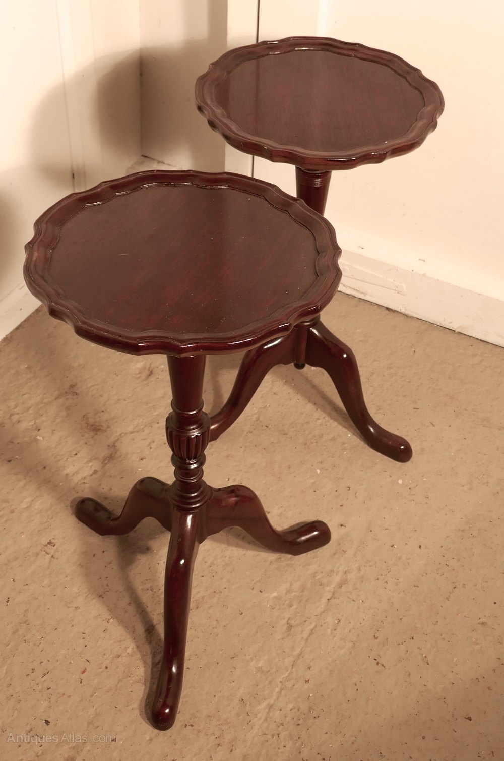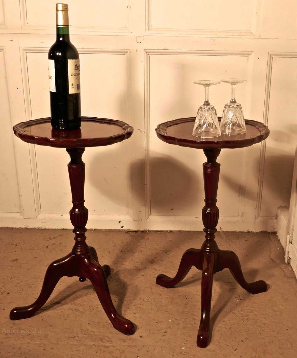 This is a very attractive pair of Mahogany wine antique tables, they stand on a slender baluster three footed leg and they have a scalloped piecrust moulding around the edge of the table top