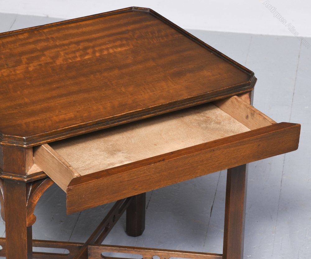 Circa 1990. A pair of George II style side antique tables. The rectangular mahogany tops with canted corners and low wrap around gallery, one of the side antique tables has a drawer on the frieze. The tables have pierced C scroll brackets to the tops of the legs, square legs, chamfered on the inside, and intersected by stylish pierced cruciform stretcher.