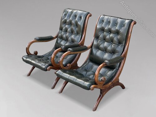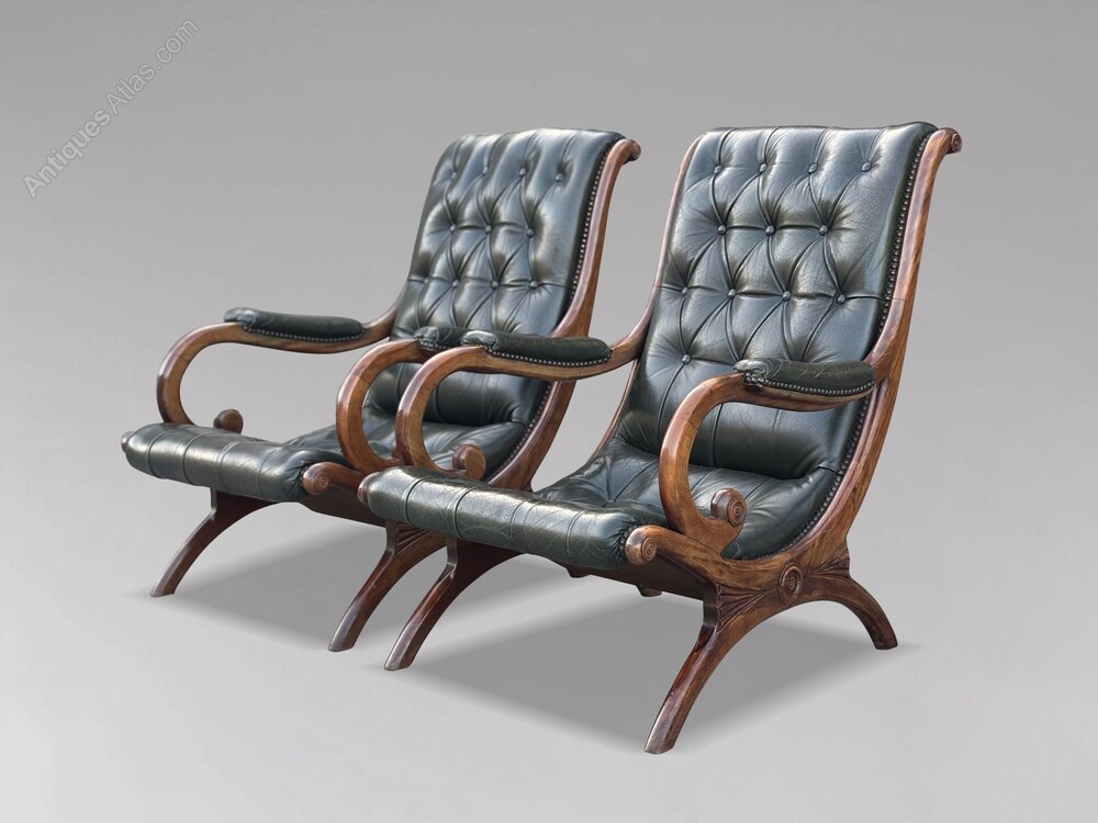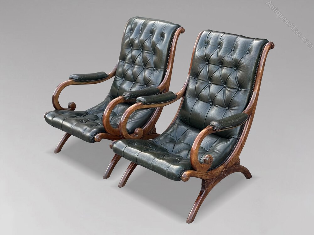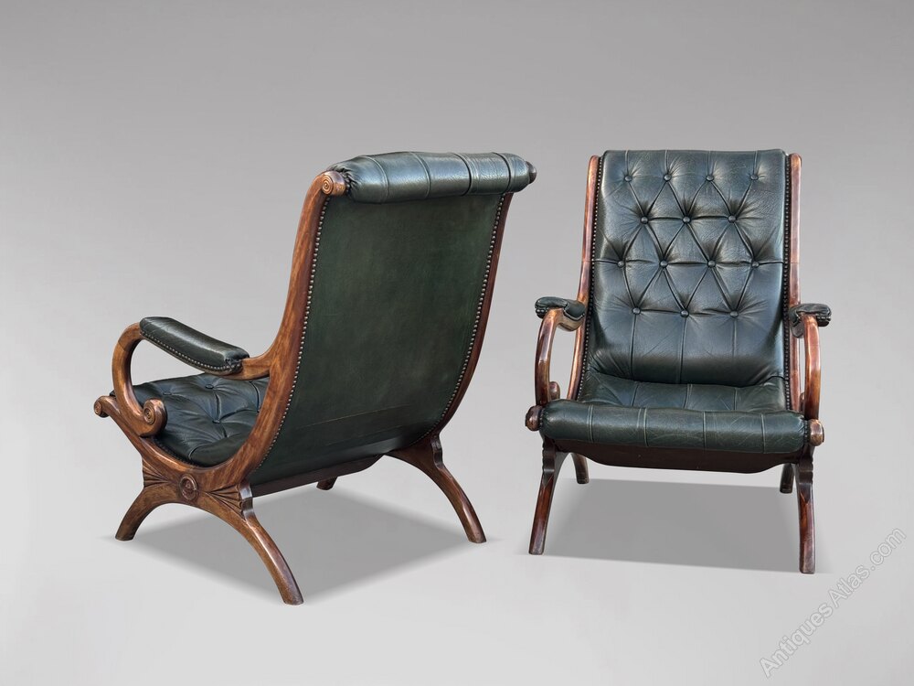 Pair of Edwardian Period Green Leather Slipper Armchairs