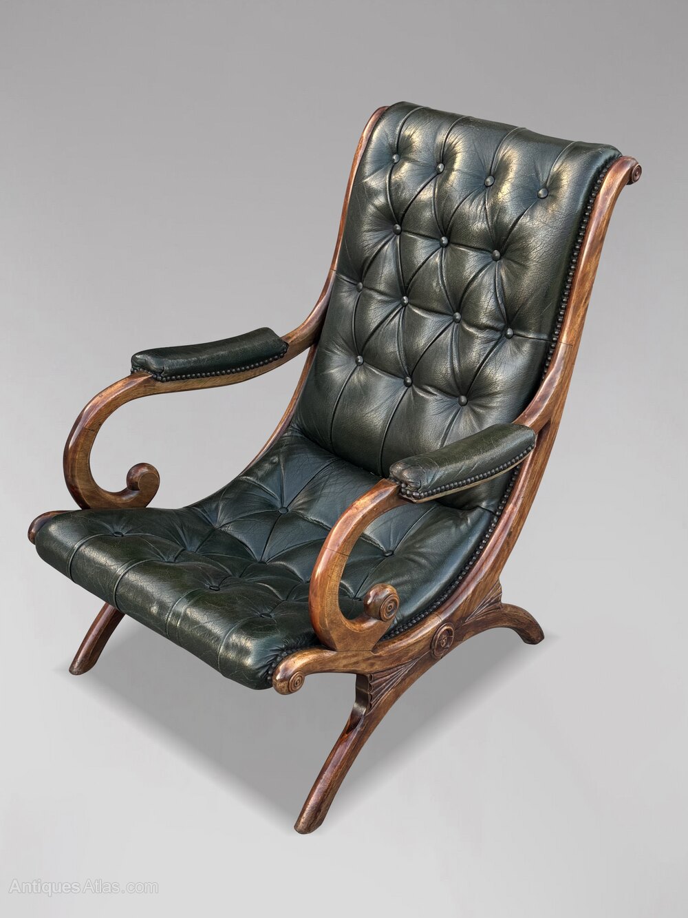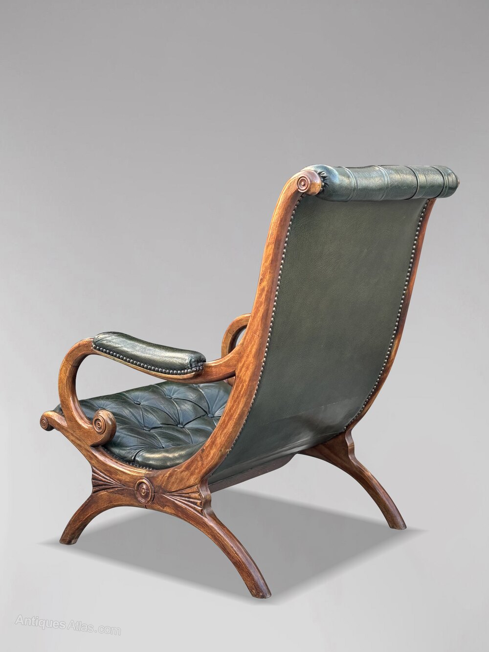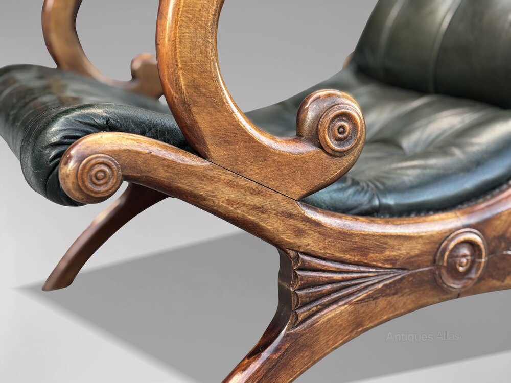 The attractive scrolled arms come with upholstered elbow rests, while the backrest and seat are gracefully curved and upholstered in the same green leather. Brass studding adorns the padded and buttoned leather arms, complemented by beautifully carved fan supports on arched legs.