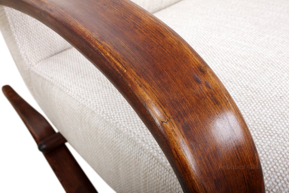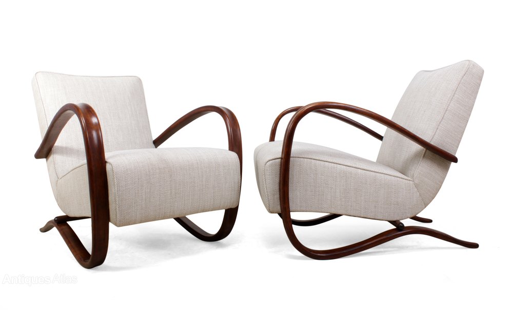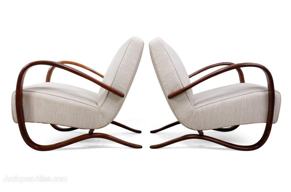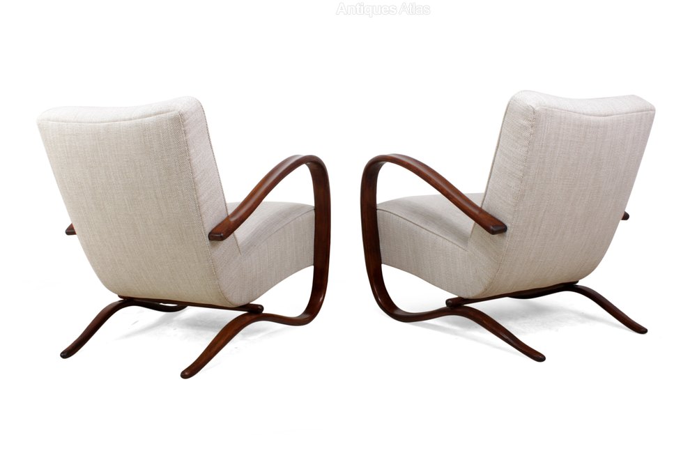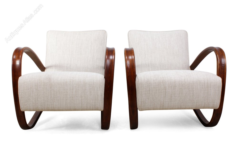 A pair of H269 Armchairs designed in the 1930's by Jindrich Halabala this example are in nicely patinated bentwood frames and re upholstered with linen style fireproof fabric covering