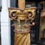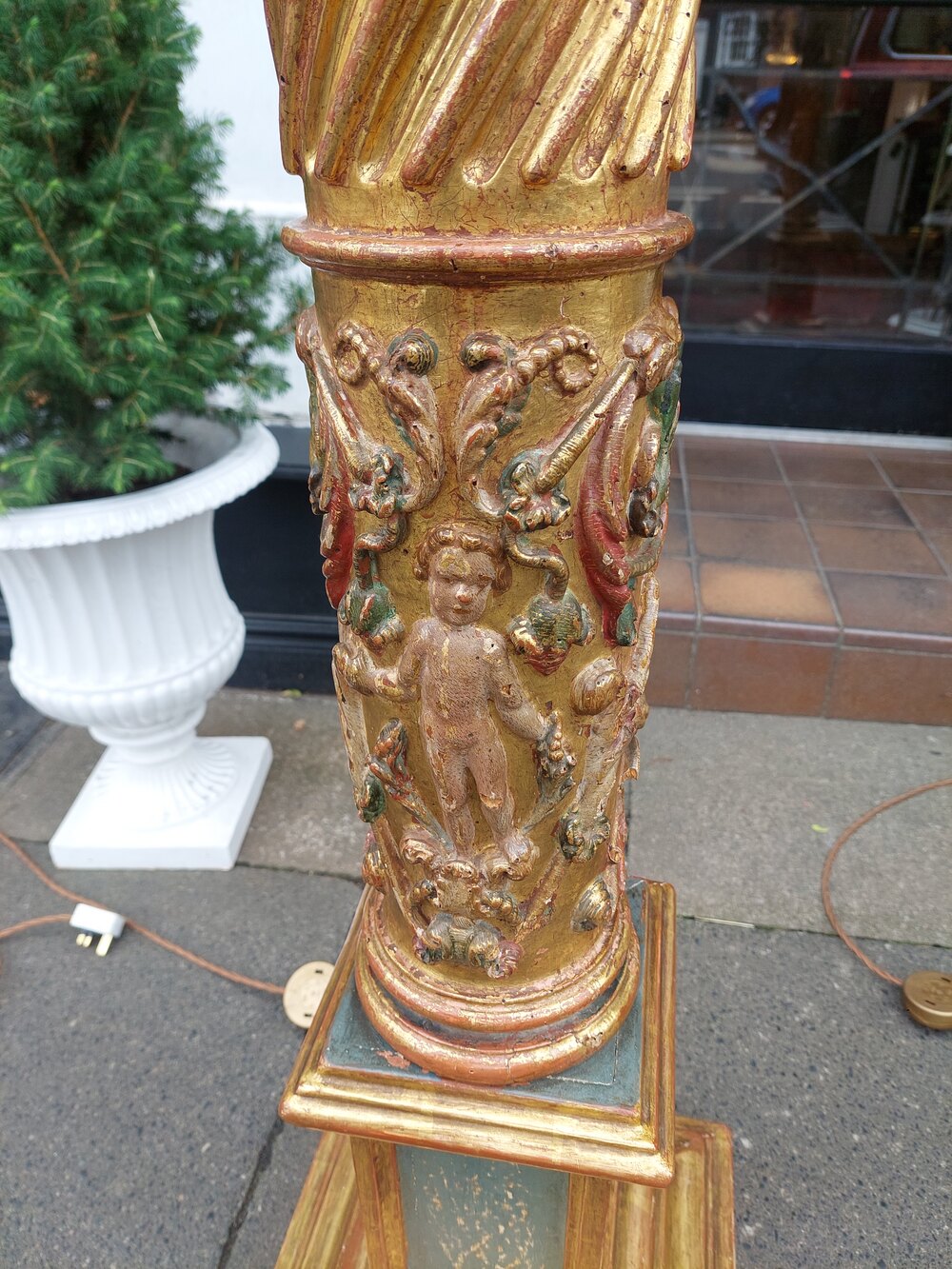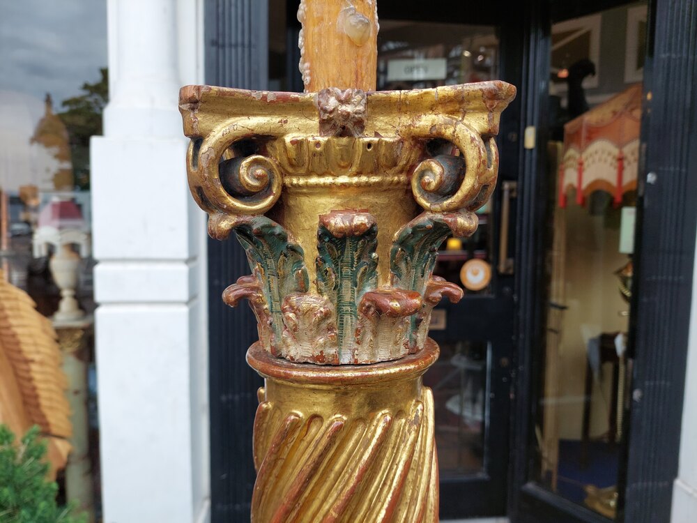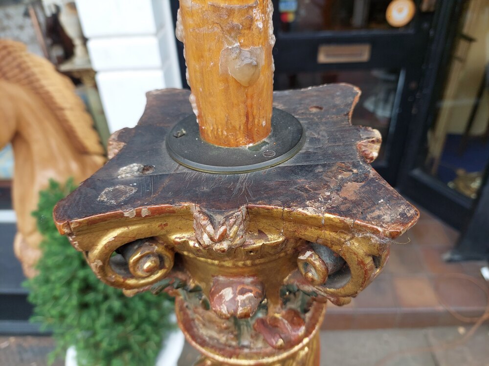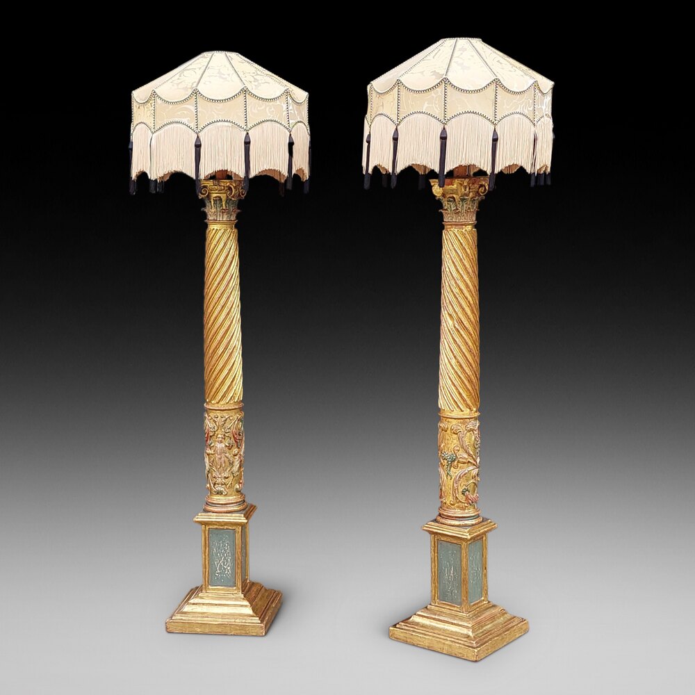 Pair of Italian 17thC Polychrome & Gilt Highlighted Carved Corinthian Columns with barley twist centres and Putti decoration standing on later square moulded plinth bases - later fitted for electric - 22" diam x 79"h - The lampshade(s) are newly handmade silks by the same maker as provides the shades for Downton Abbey - all lights and lamps have been rewired with authentic corded flex, fitted with either foot switch or finger clicker switch and are Pat tested