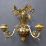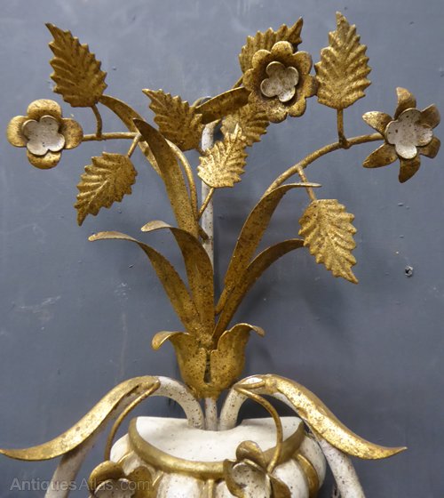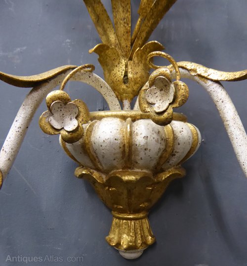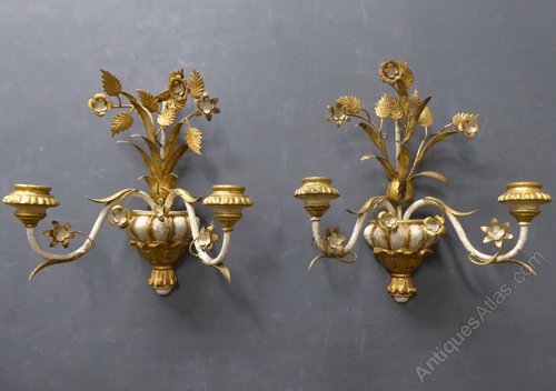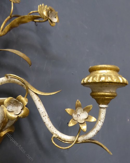 Ref 7692 - Pair of vintage Italian two arm flower and leaf decorated wood and metal wall lights finished in original gilt and patinated white paint. For candles or can be wired. Circa 1950.