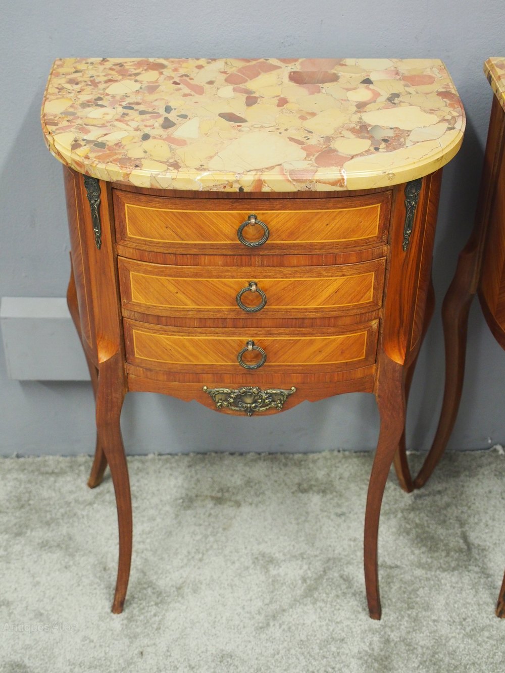 Circa 1950s, pair of mid 20th century bow front bedsides or chest of drawers. The scagliola marble tops over three drawers and an ormolu decorated frieze, standing on neat cabriole legs.