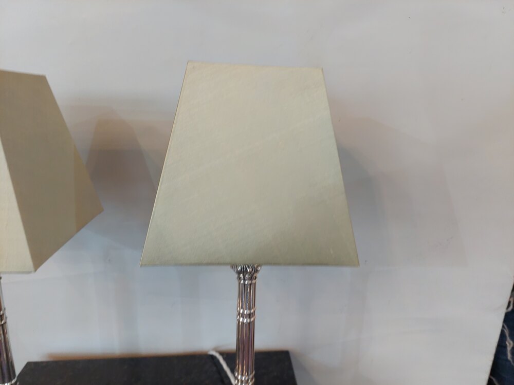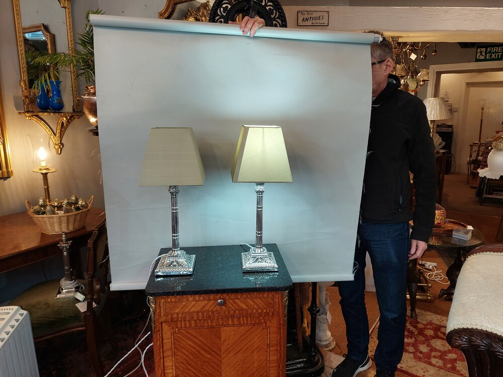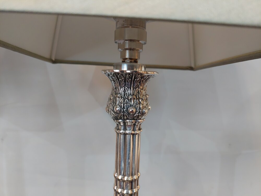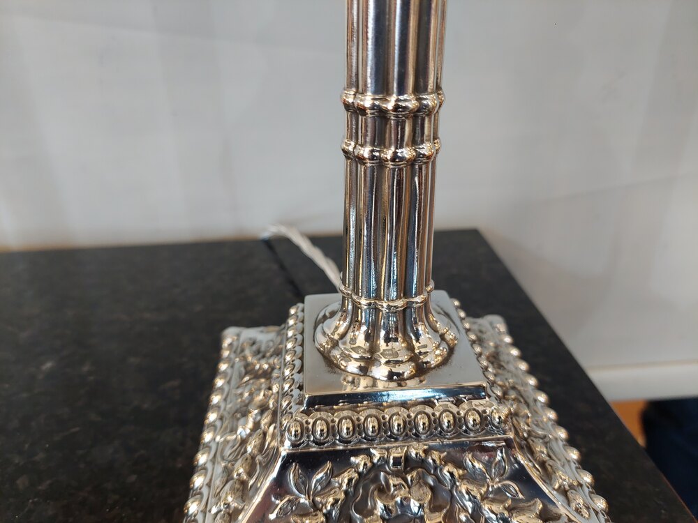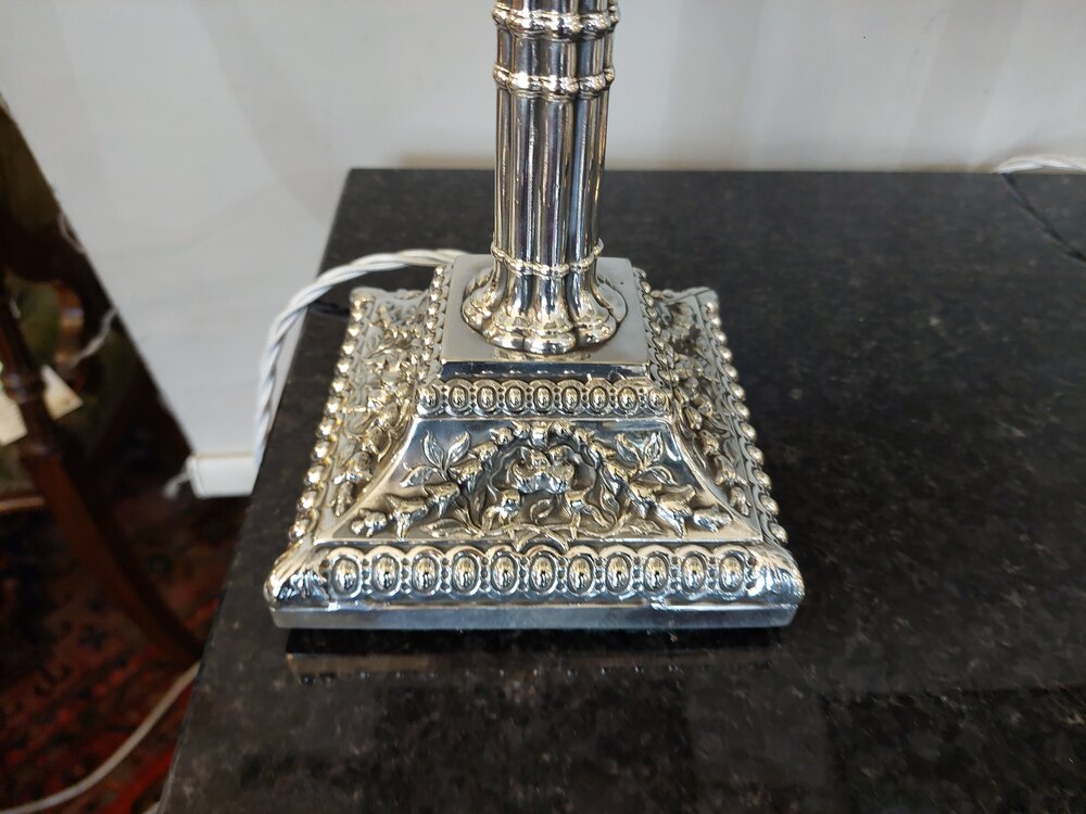Pair of Mid 19thC Victorian Candlesticks - EPGS cluster-column with heavily decorated stepped base and candle holder, converted to electric - 8" diam x 20.5"h - all lights and lamps have been rewired with authentic corded flex, fitted with either foot switch or finger clicker switch and are Pat tested