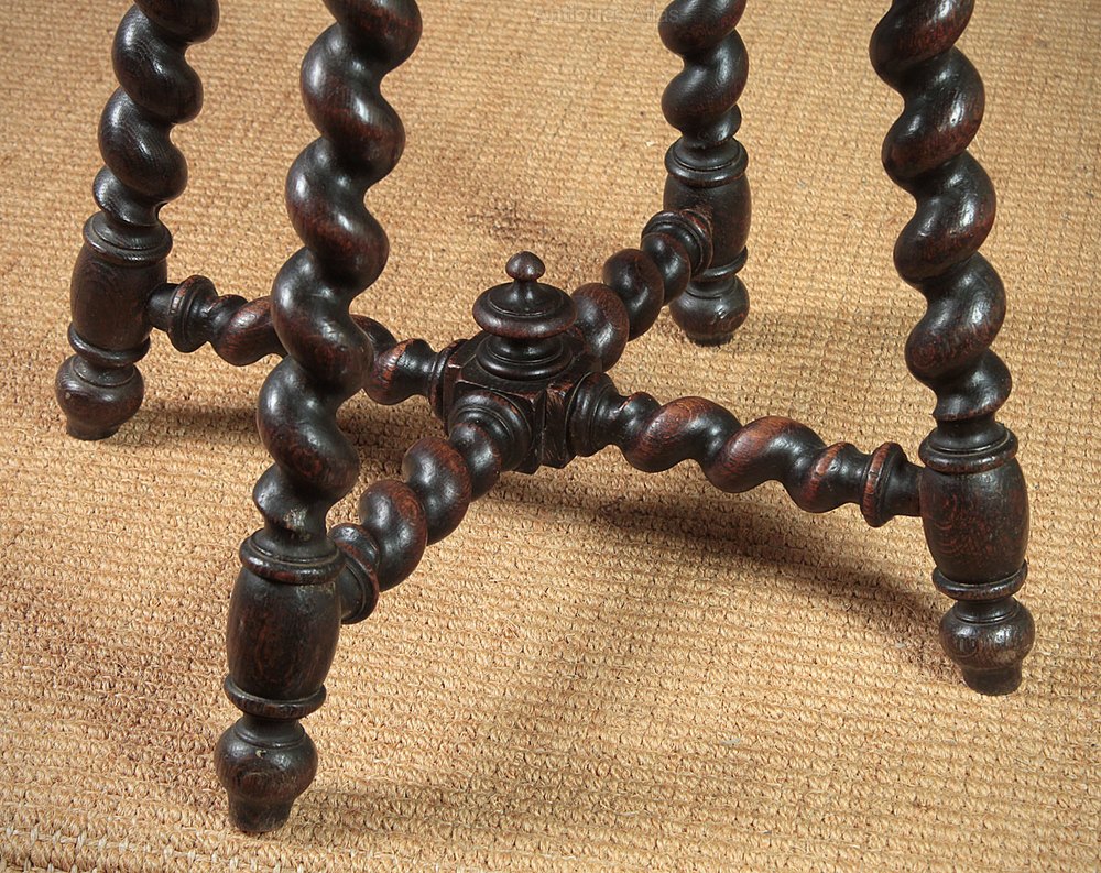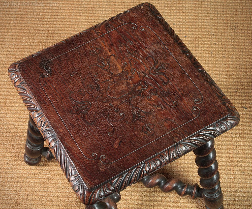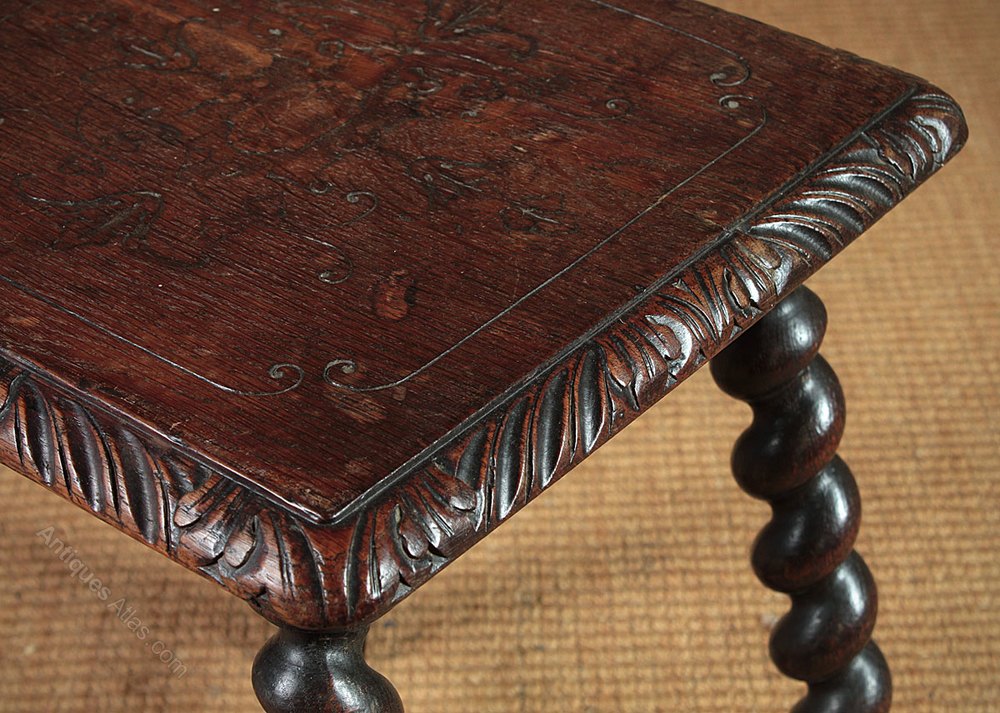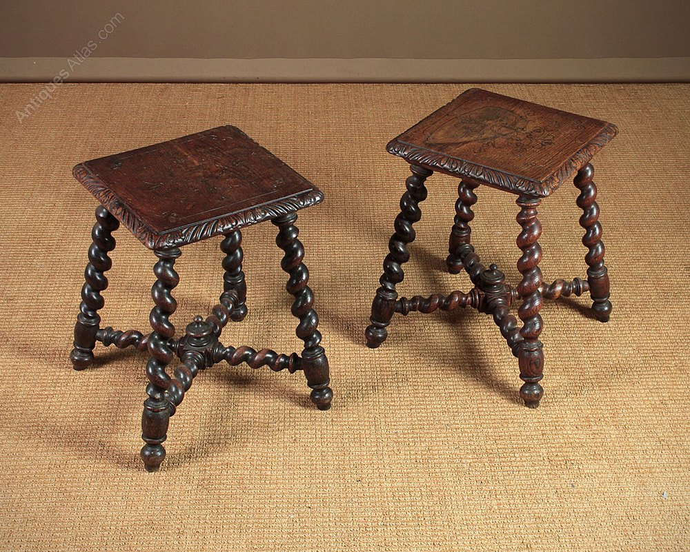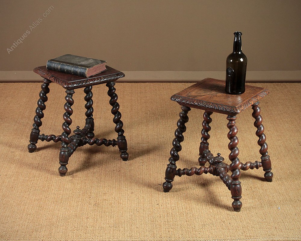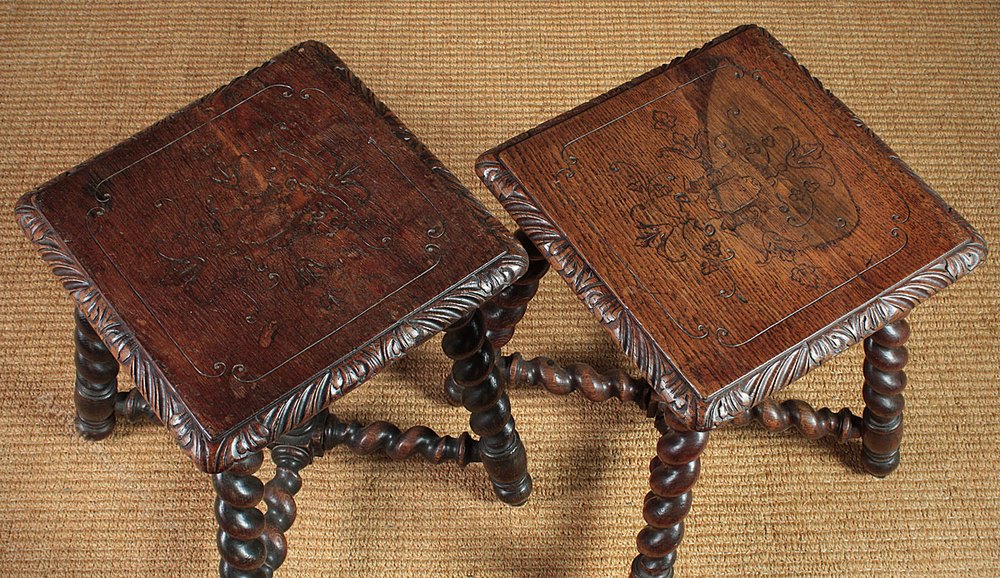 Great pair of oak antique tables or stools c.1890. Single piece tops with carved detail, which continues around the molded edge, all raised on barley twist legs with matching stretchers joining at a central block with a turned finial. Excellent condition, cleaned and waxed in our workshops.