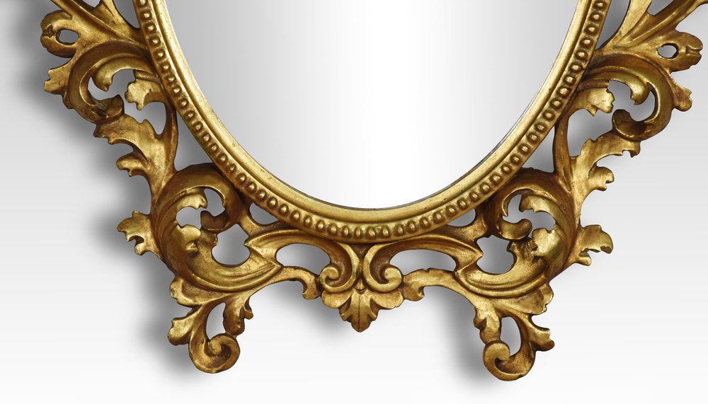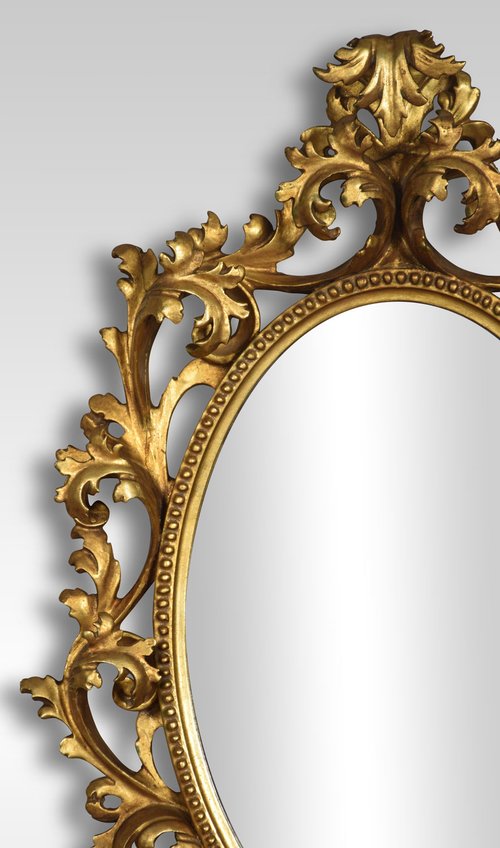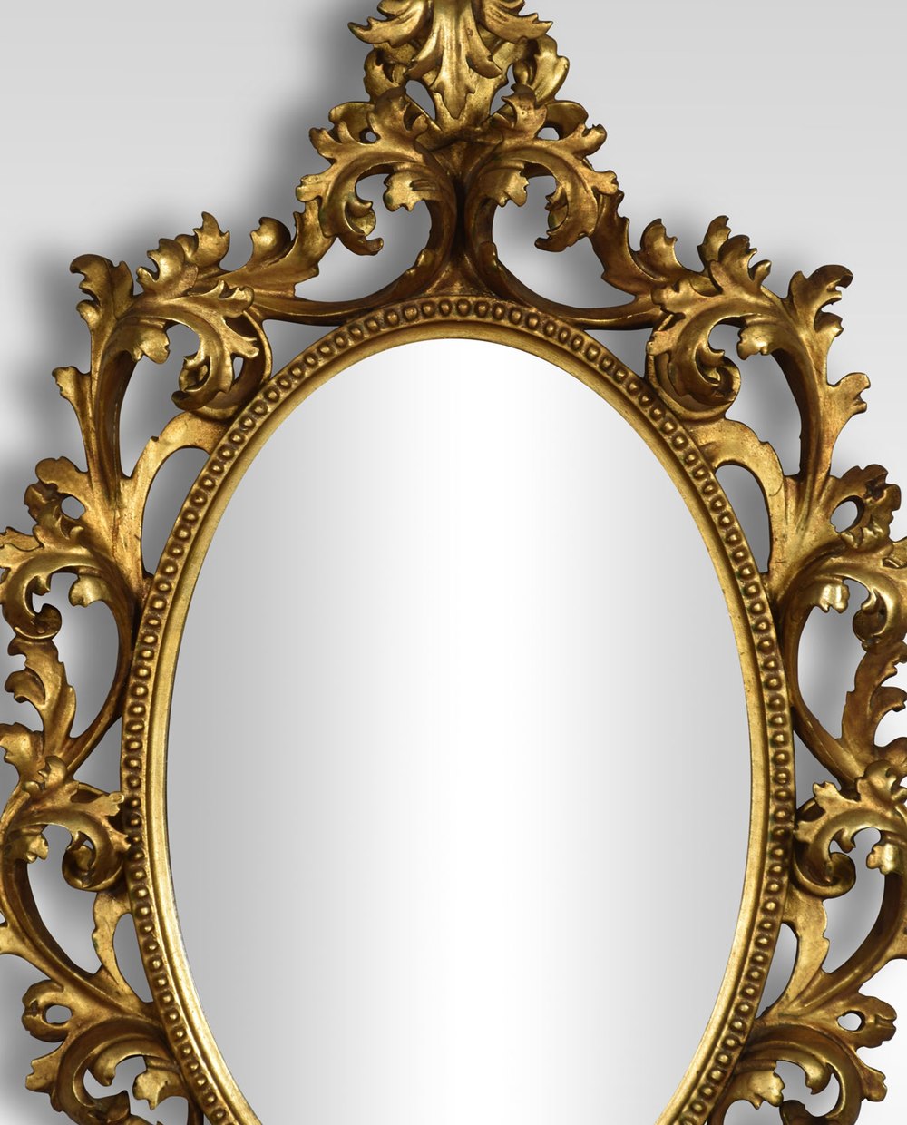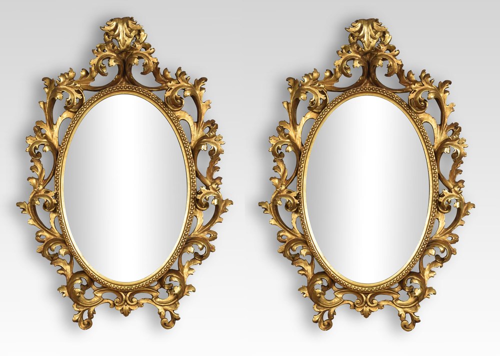 Pair of oval giltwood wall mirrors with carved and pierced scrolling foliate carved frames surrounding the original mirror plate.