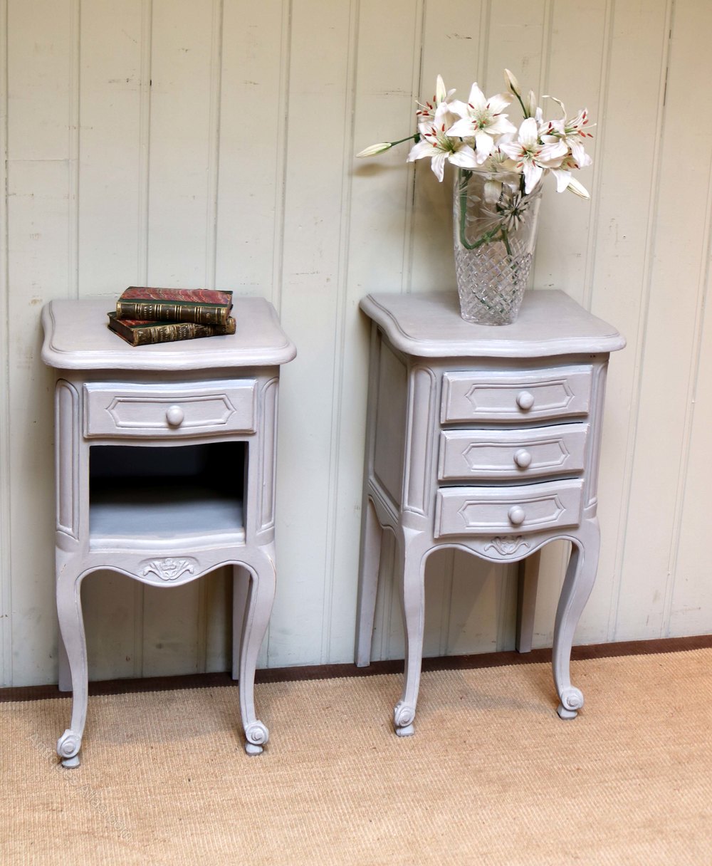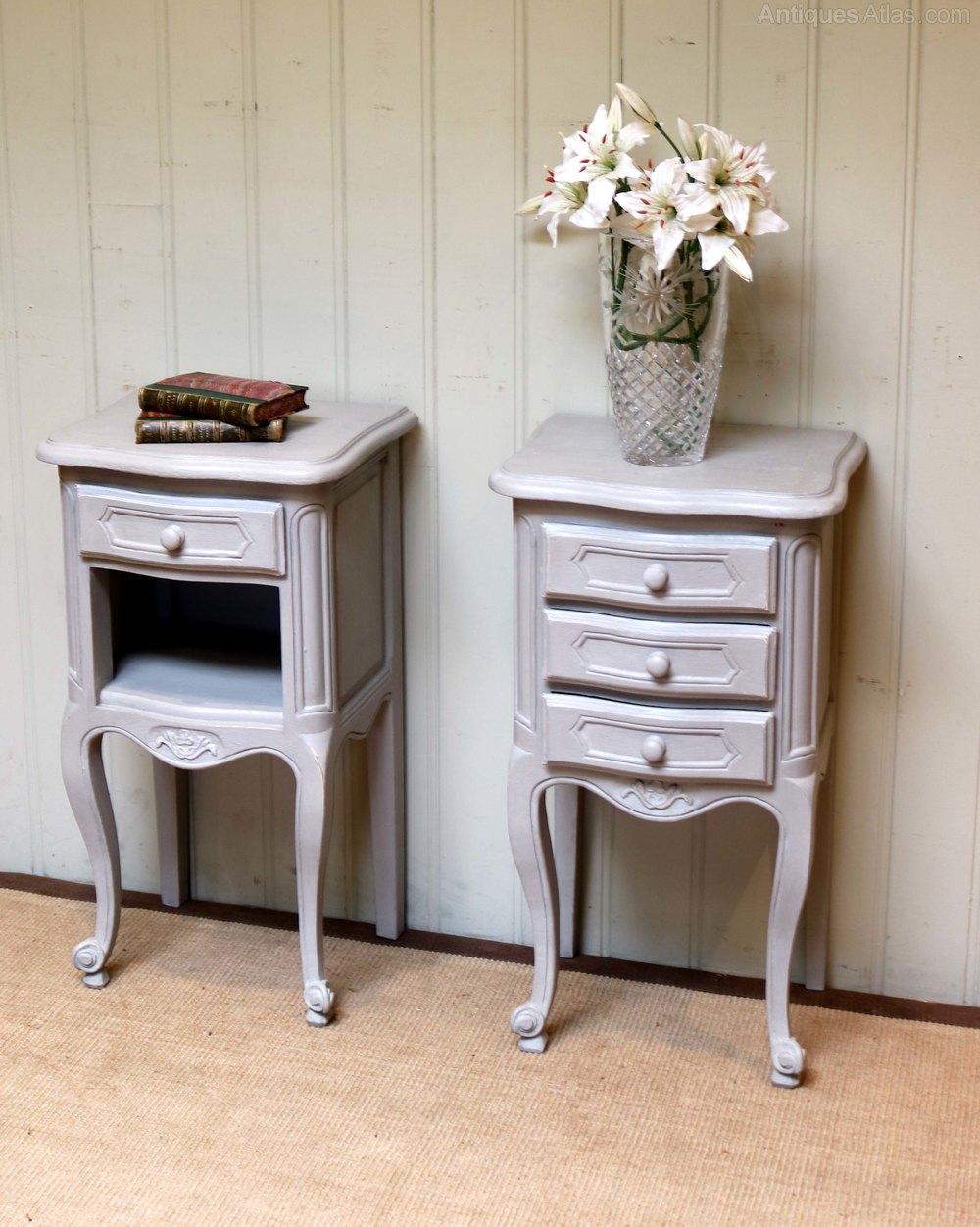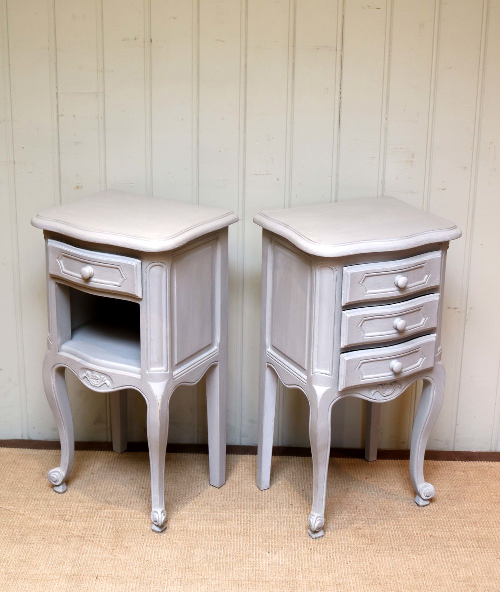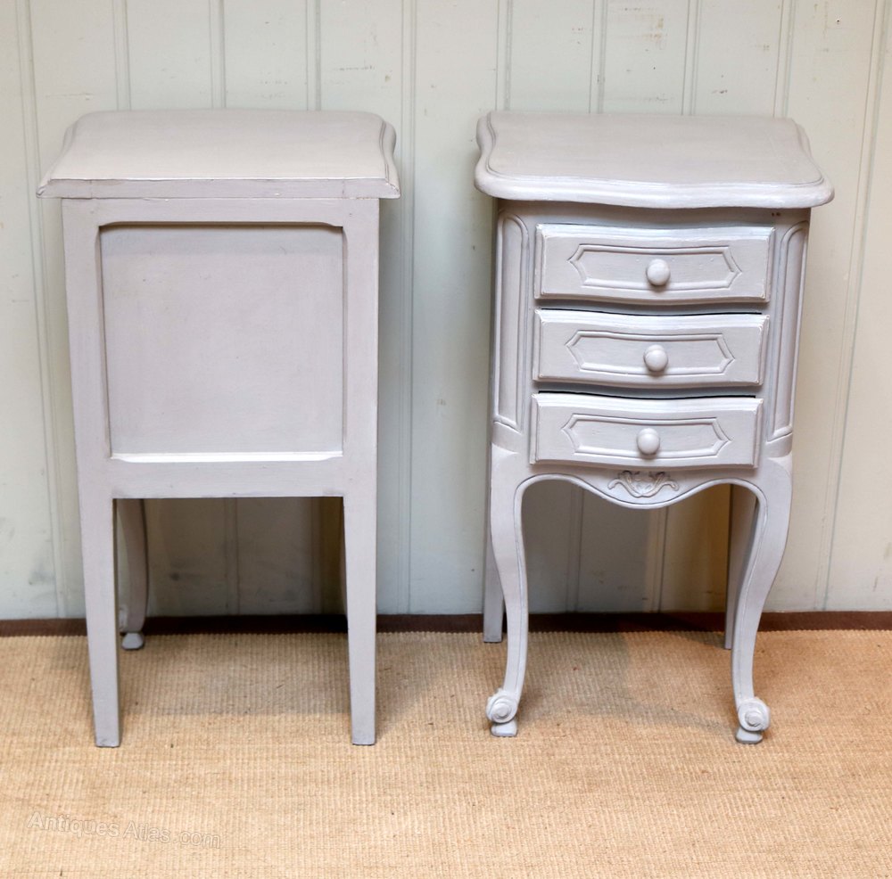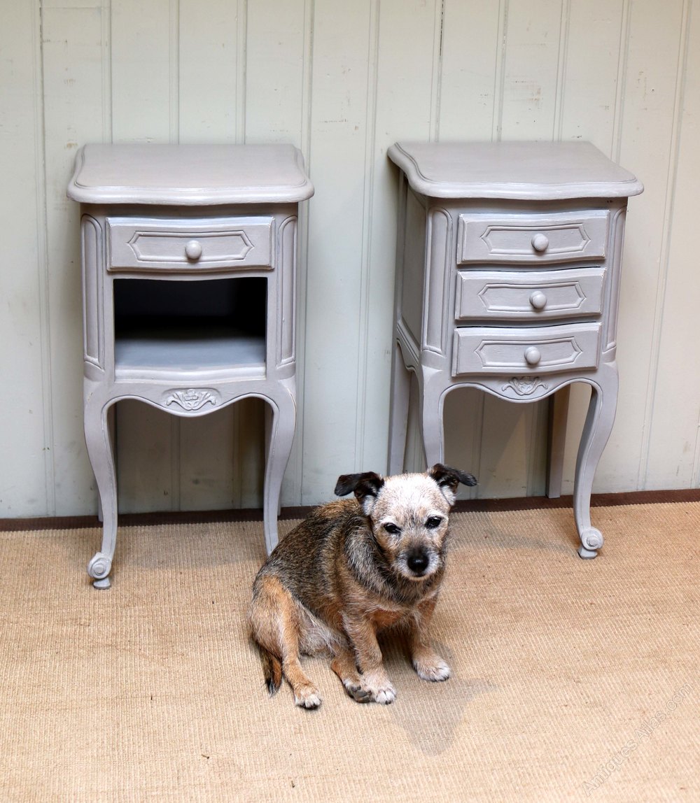 Pair of French painted bedside cabinets having a single drawer above an open cupboard base with panelled sides raised on cabriole legs