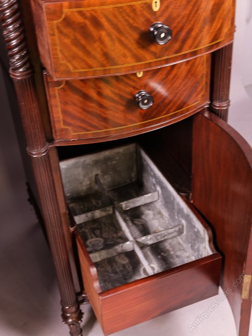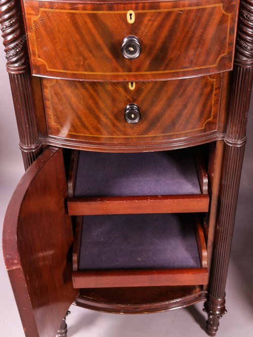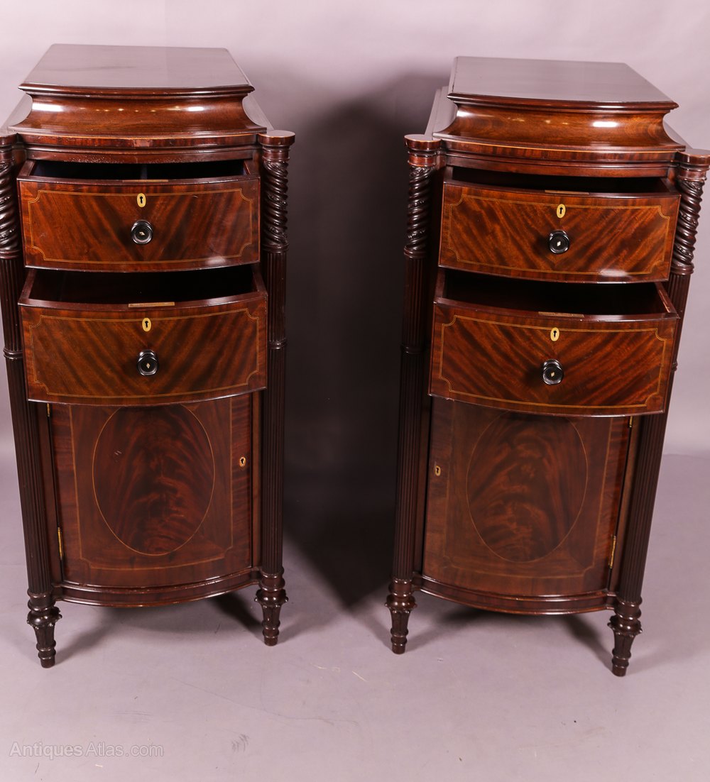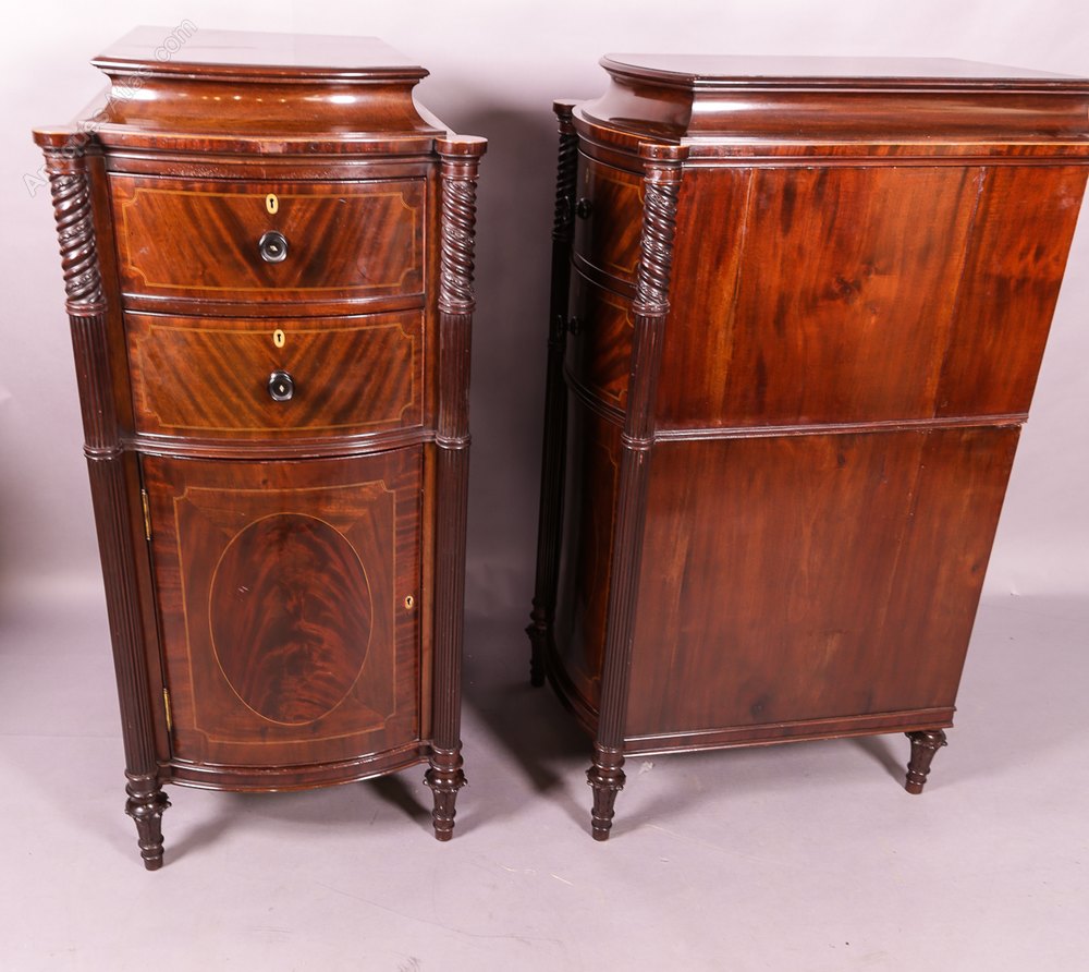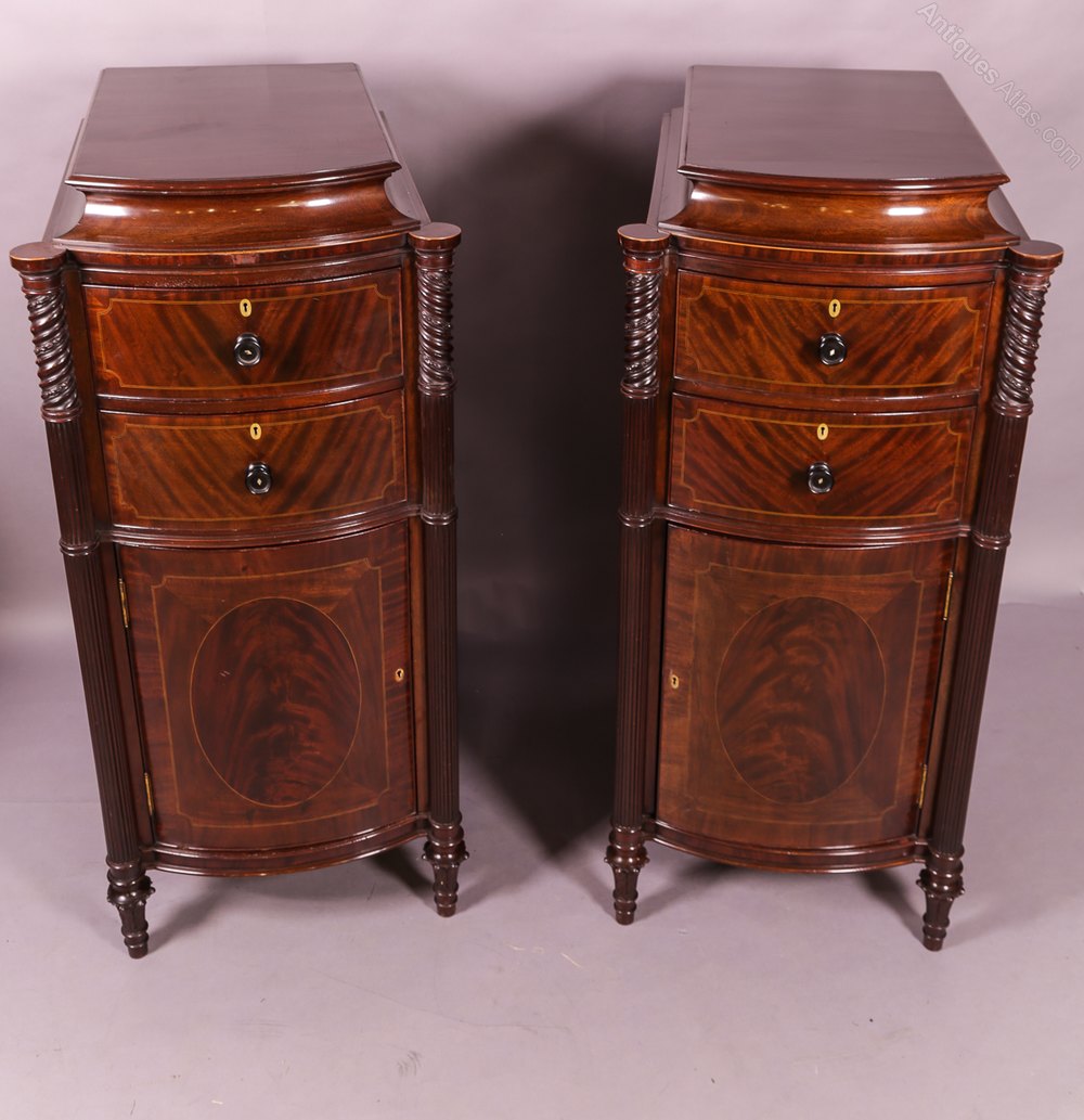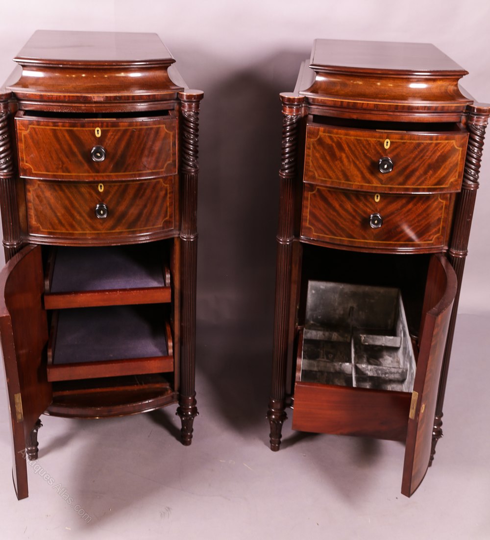 A Good Pair of Bedside Chests (adapted) they could also be used as dining room pedestals, they are in Mahogany with Boxwood string inlay, each one has two drawers and one cupboard with a cellerette in one and a pair of sliding shelves the other. the condition is excellent.