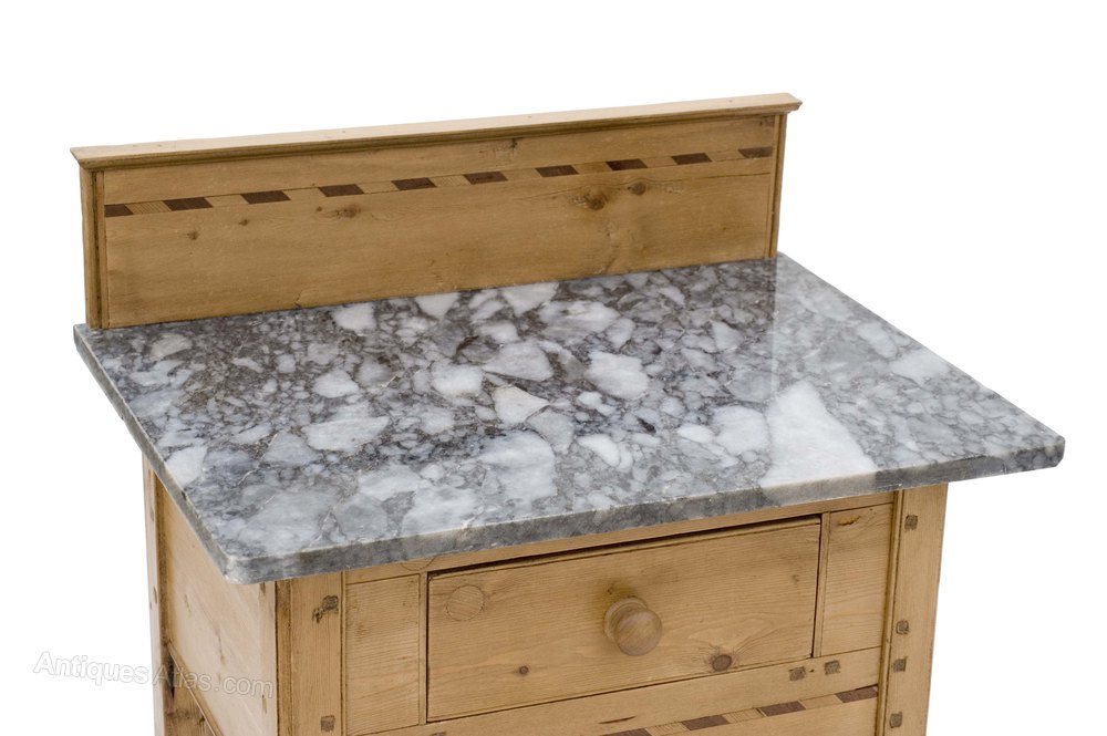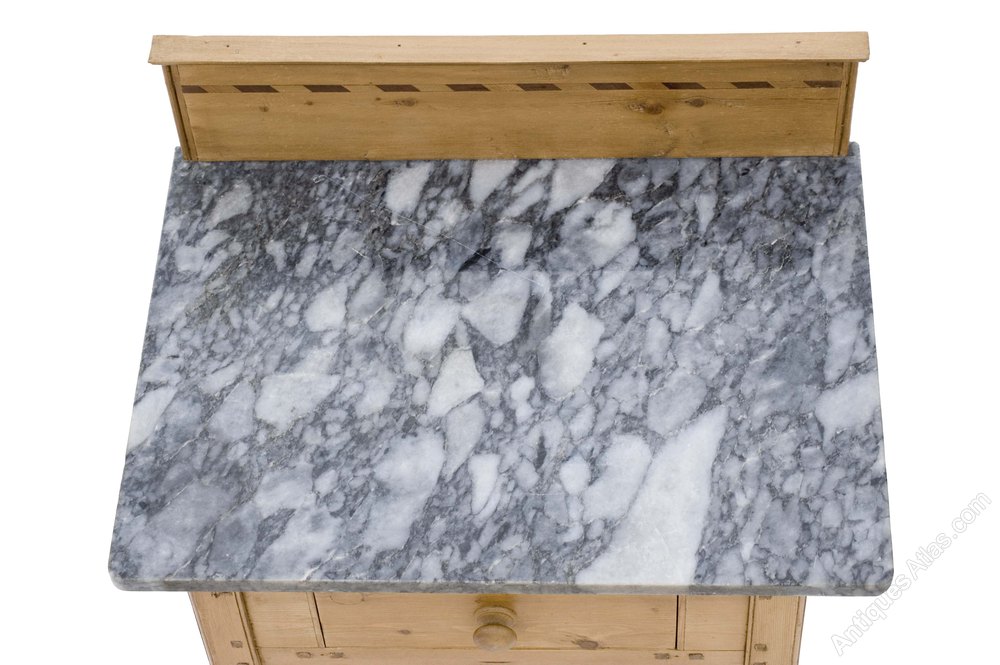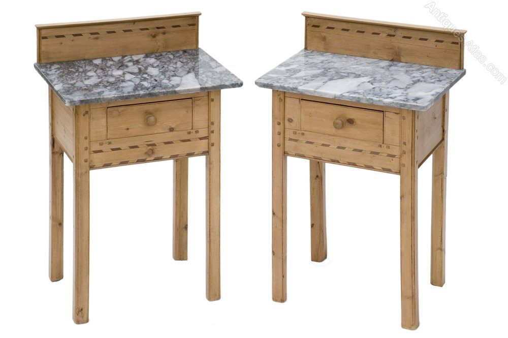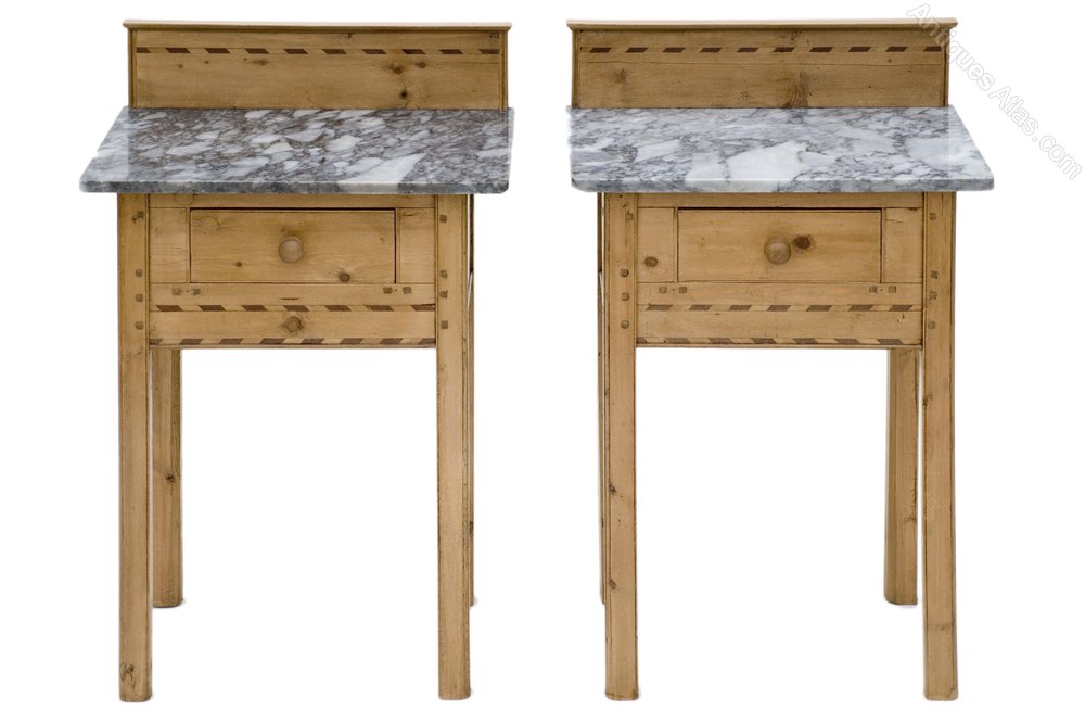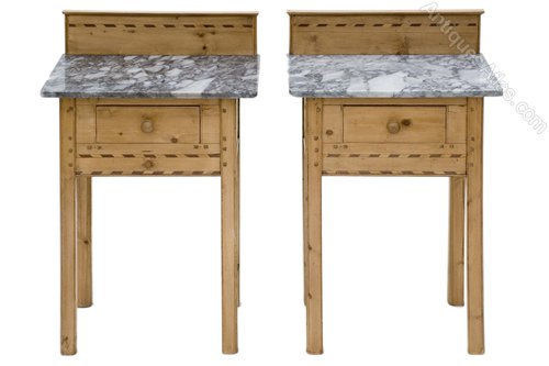 Antique pair of inlaid pine and marble bedside antique tables, cupboards or cabinets