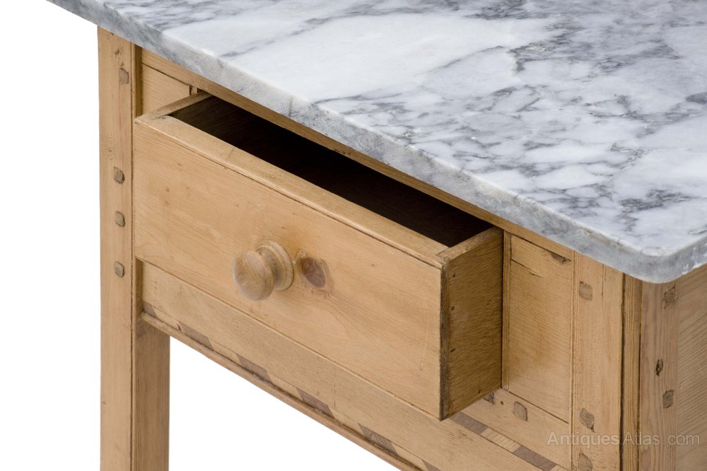 Historic knocks, marks, repairs and alterations, as is always the way with antique furniture. The drawers appear to be later additions and are crudely constructed, but strong, functional and slide freely. There are some historic chips, scratches and marks to the marble tops, which are unfixed.