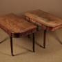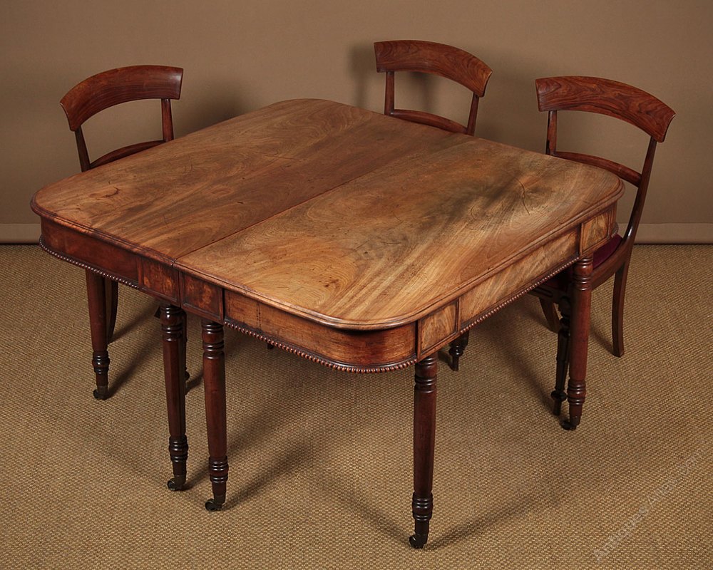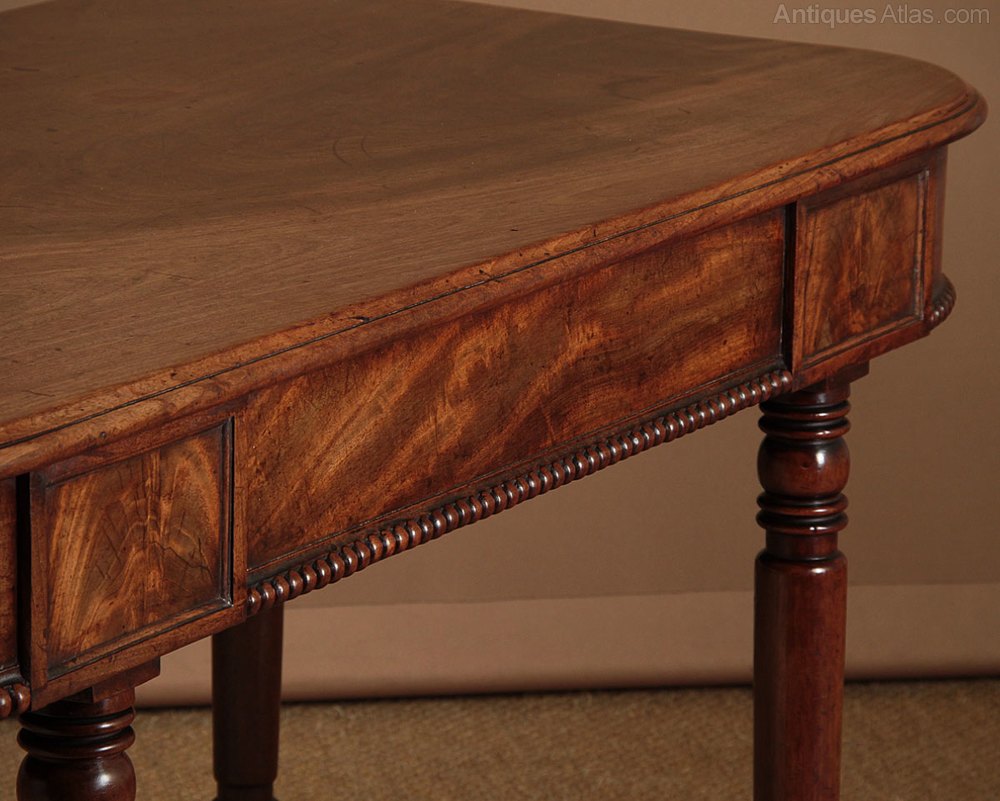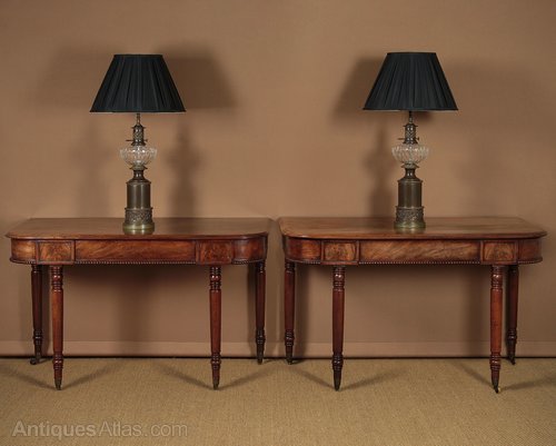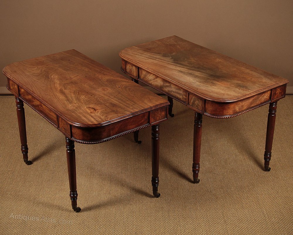 Fine pair of Regency mahogany side antique tables c.1820. Superb single piece solid mahogany tops of particularly good grain with rounded front corners and moulded edges. Over a flame mahogany veneered apron with moulded cartouche above the legs and unusual bead carved lower edge. Crisply turned and tapering legs raised on the original brass cup castors. Ideal as a pair of elegant console tables or can be pushed together to make a 49″ x 52″ table for six. Some obvious wear and discolouration to one of the tops. Otherwise very good condition, cleaned and waxed in our workshops.