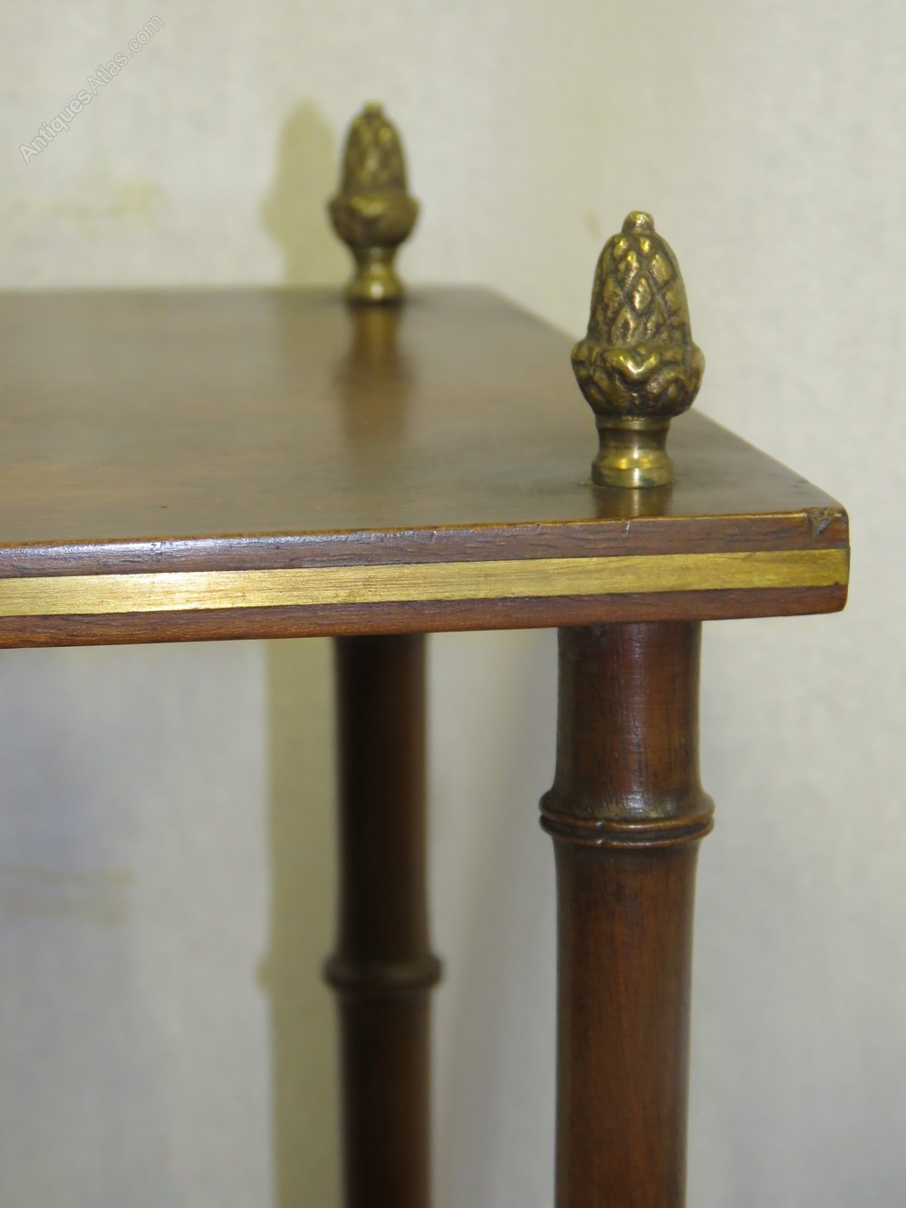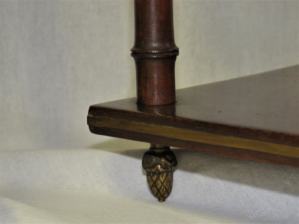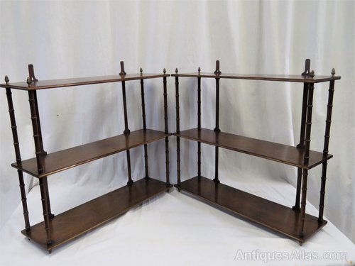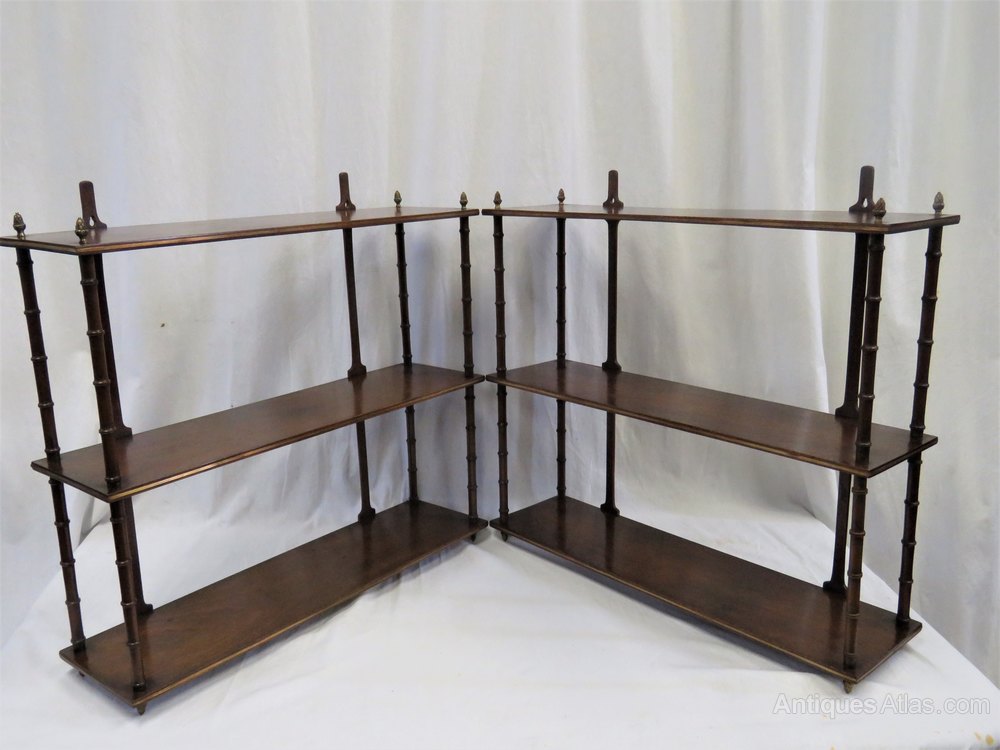 An elegant and decorative pair of hanging shelves dating from the Regency period. They are made from mahogany with turned faux bamboo uprights and have brass finials to the top and bottom as well as brass inlay to the shelves.