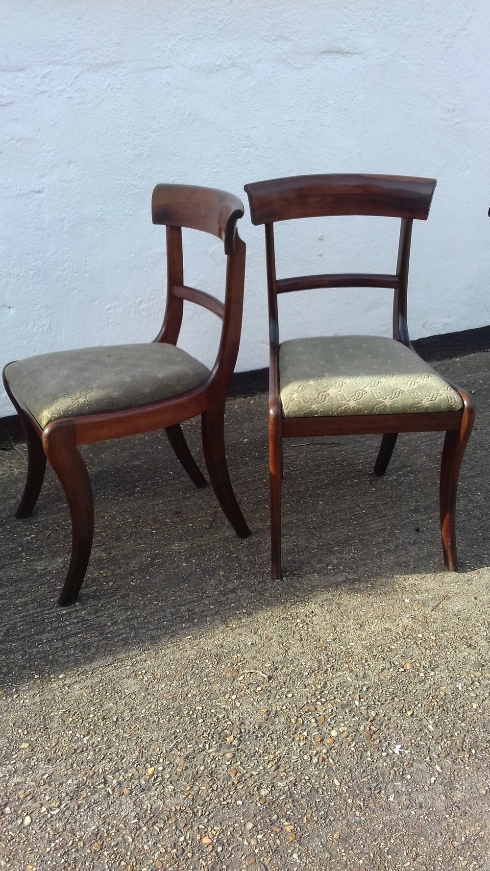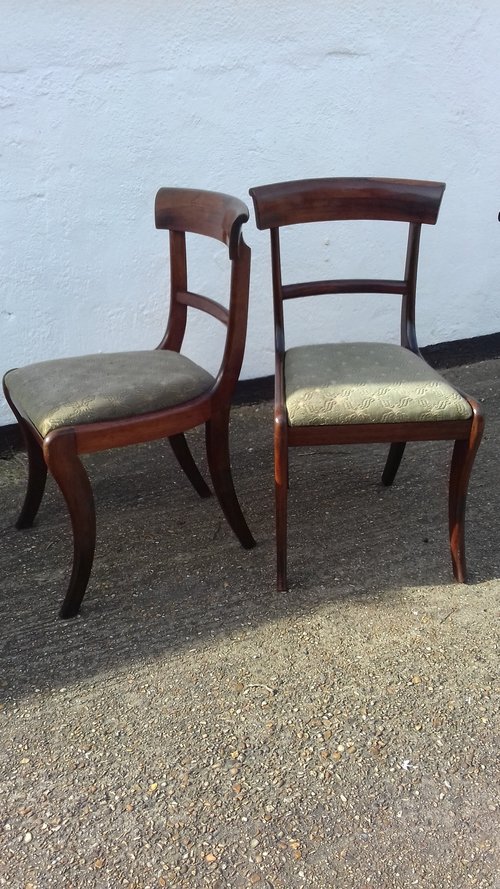 Pair of rosewood Regency chairs with saber legs and drop in seats that need recovering.
