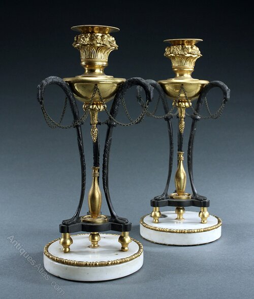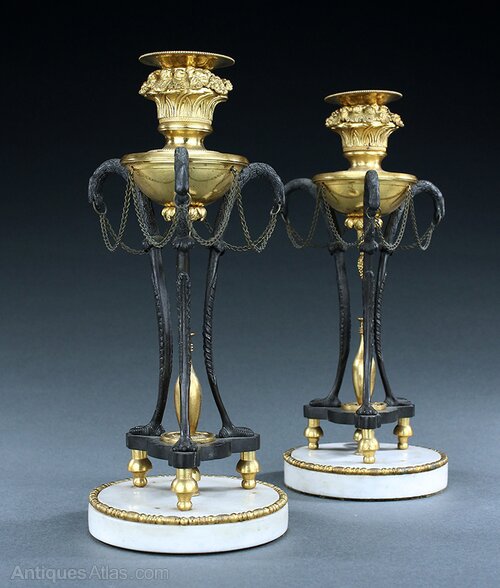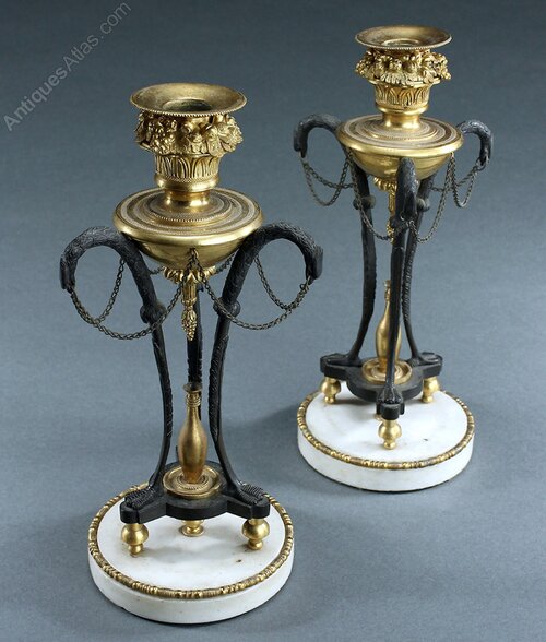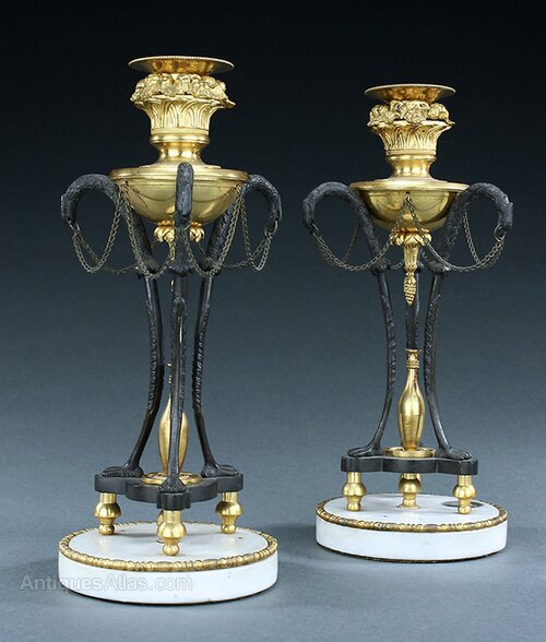 A fine pair of very elegant late 18th/early 19th century, possibly Russian, patinated and gilt ormolu bronze Athenienne style triform candlesticks. Classical zoomorphic bird legs with original connecting chains surmounted with a gilt bronze urn and basket filled fruit and flowers design candle cups. Toupie feet and white marble circular bases with ormolu edging. One retains an old label 'Certified by the British Antiques Dealer Association'. For an almost identical pair of candlesticks see Sotheby's sale, 'Important Mobilier, Sculptures Et Objets D'Art', Paris 11th April 2018, lot 215.