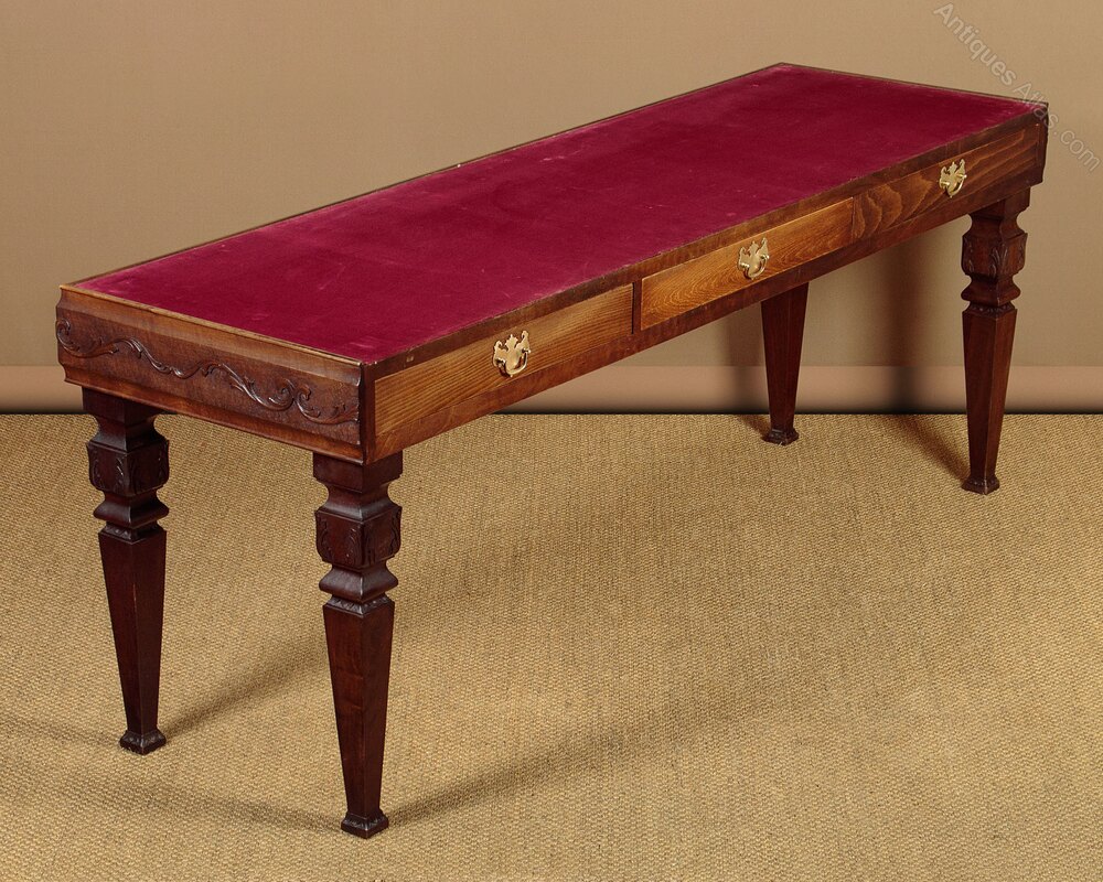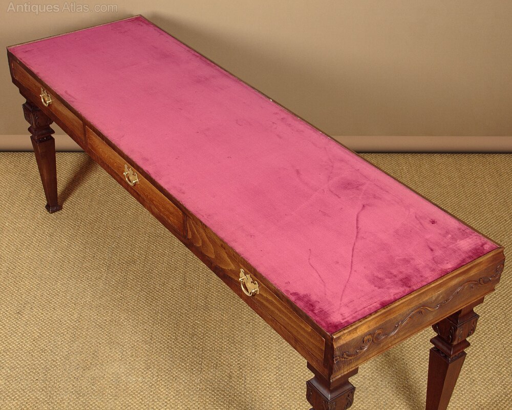 Unusual pair of long shop display tables c.1930. Red velvet lined table tops with a raised edge to the front and sides. Attractive carved frieze of scrolling foliate forms running around the front and sides of both tables. The plain rear sides hold three large drawers with brass handles. Raised on square tapering legs with carved detail front and rear. Excellent condition, cleaned and waxed in our workshops.