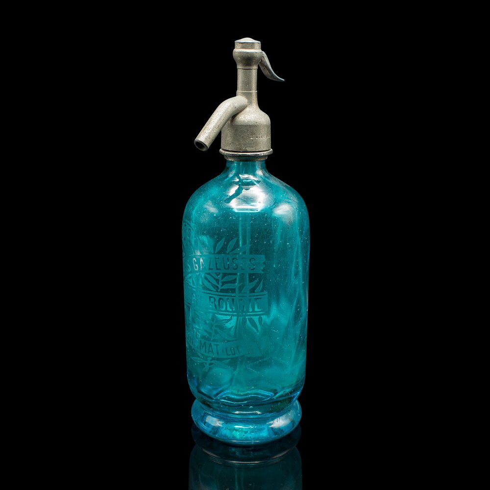 These charming seltzer bottles display beautifully, with their vibrant glass hues, etched branding, and period charm. Substantial in weight and craftsmanship, each bottle features a steel lid with integrated pouring spout, engraved with the dates 1913 and 1932 respectively. The etched labels denote the original seltzer manufacturers, adding authenticity and decorative appeal. Perfect as vintage kitchenware, home bar display pieces, or collectable French glassware.