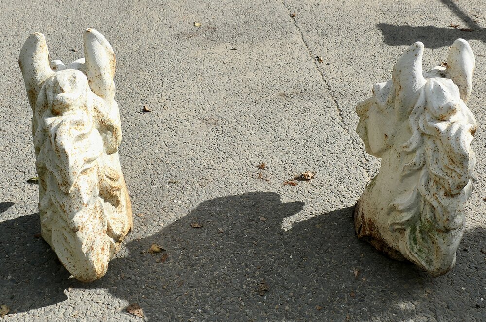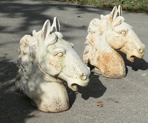 The horses heads are in their original white paint which is sound and has a slightly weathered finish showing a bit of the rust having worked its way through, they are otherwise in very good condition