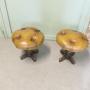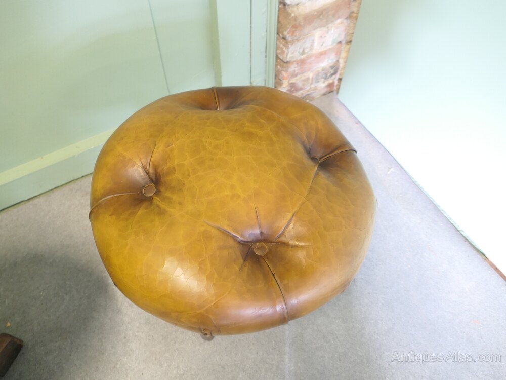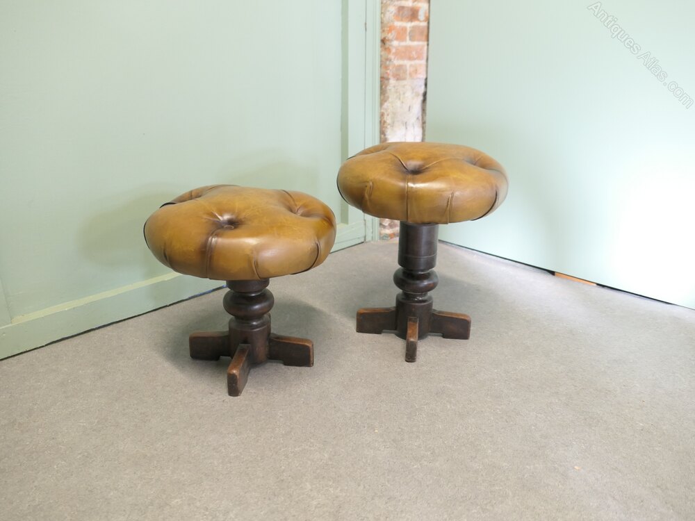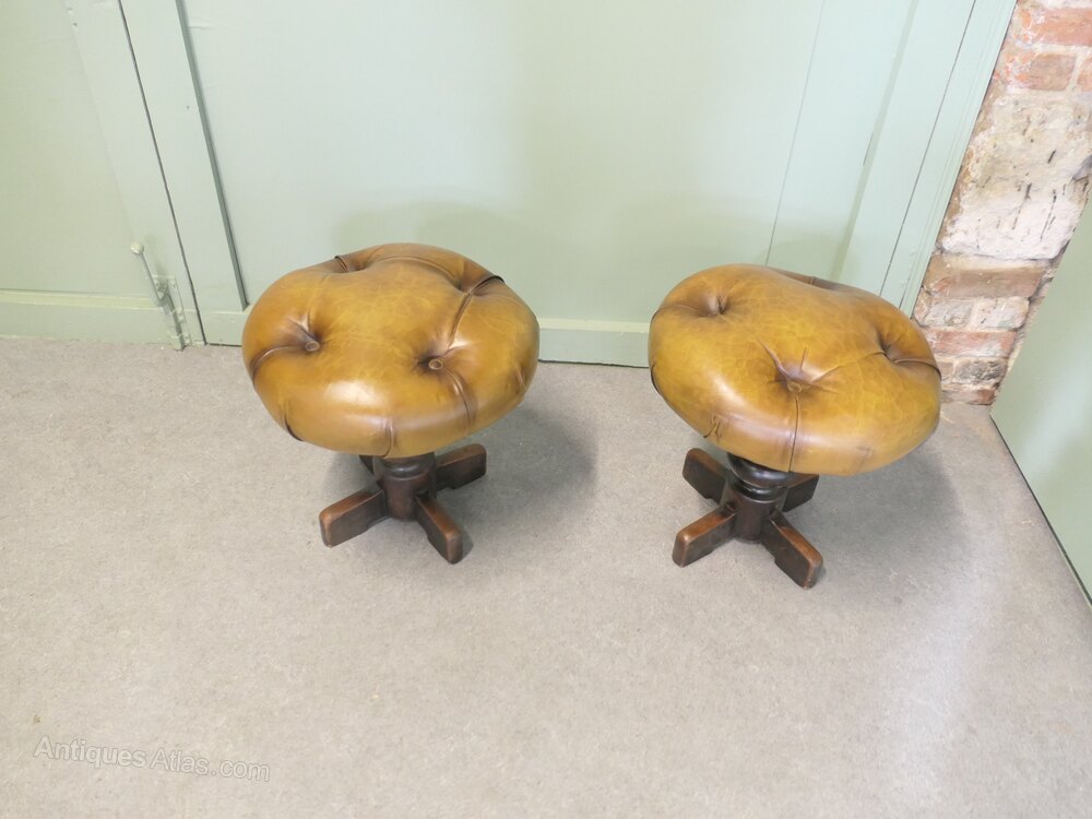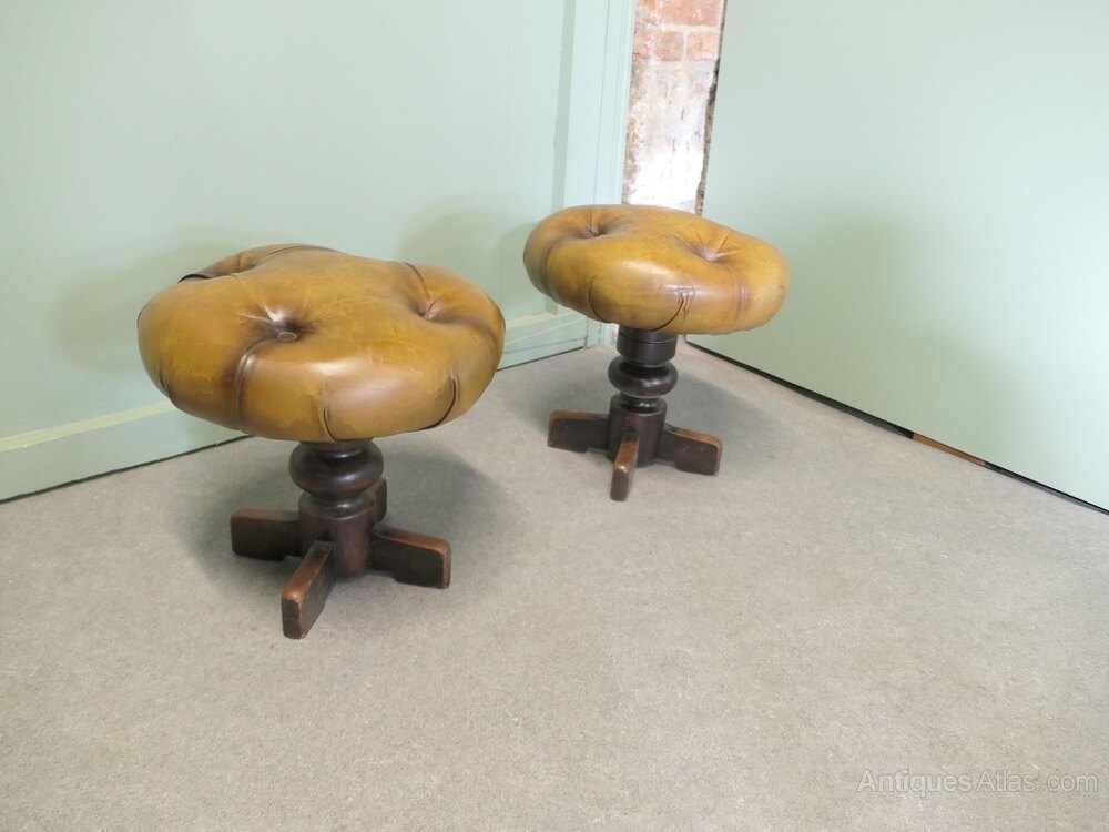These are sturdy heavy quality pieces, the stools rise and fall when swivelled they have a heavy baluster column with a 4 footed base, the tops are deeply upholstered with good thick hide, this is old but still in good condition