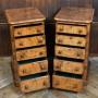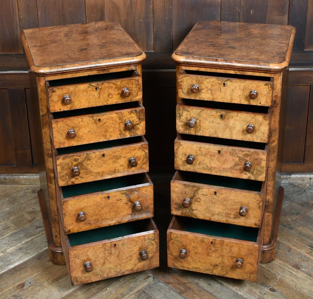 Wonderful pair of Victorian burr walnut bedside drawers in wonderful antique condition. Each set features five graduating drawers, all beautifully lined in green baize and fitted with twin turned walnut knobs. The rich burr walnut veneers display a captivating grain, lending warmth and character to their compact form. Their scale makes them ideal for bedside use, yet their craftsmanship and patina elevate them well beyond mere utility. As with all genuine antiques, minor imperfections consistent with age and use are present, enhancing their authenticity and charm.