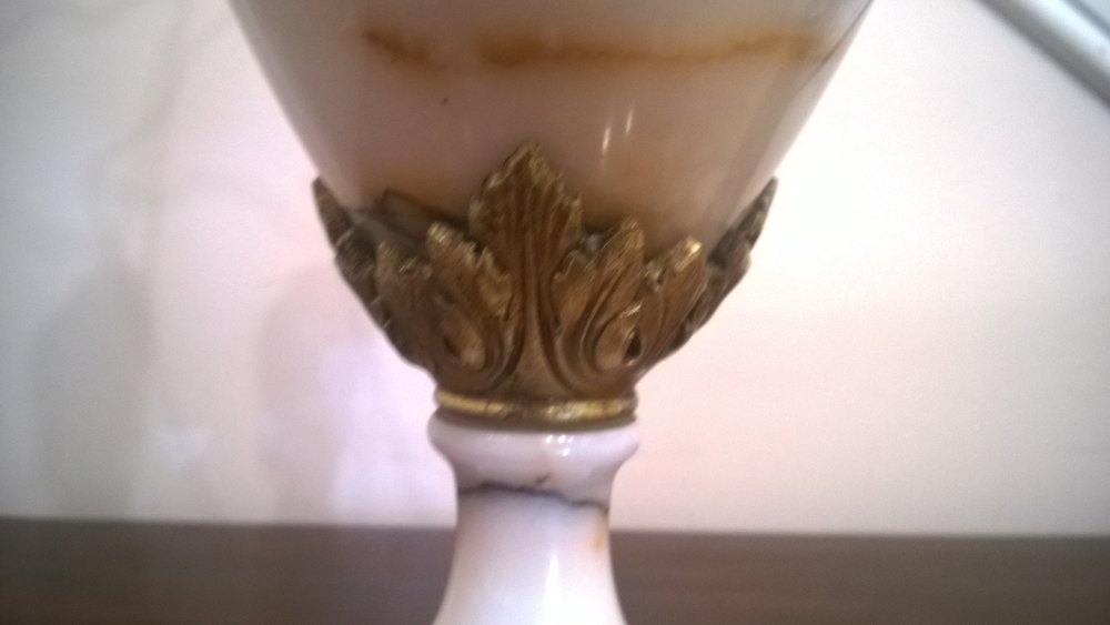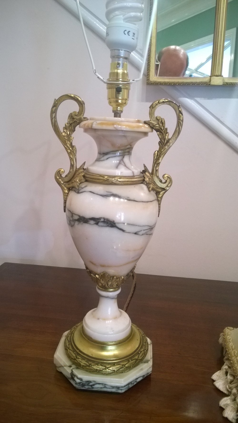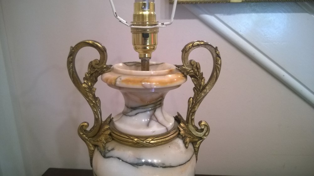 Pair of Victorian Carrara Marble and Gilt Metal Decorated Urns conveted to electric lamps - all lights and lamps have been rewired with authentic corded flex, fitted with either foot switch or finger clicker switcth and are Pat tested. 16"w x 12"d x 32"h