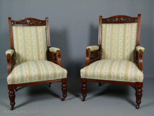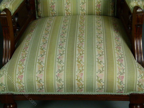 The chairs are covered with a pretty damask fabric, with a floral and stripe design, in cream, green and light pink colours.