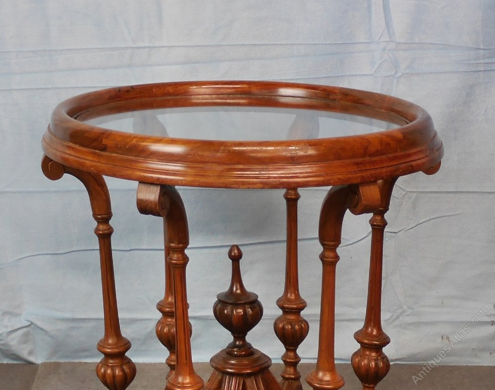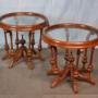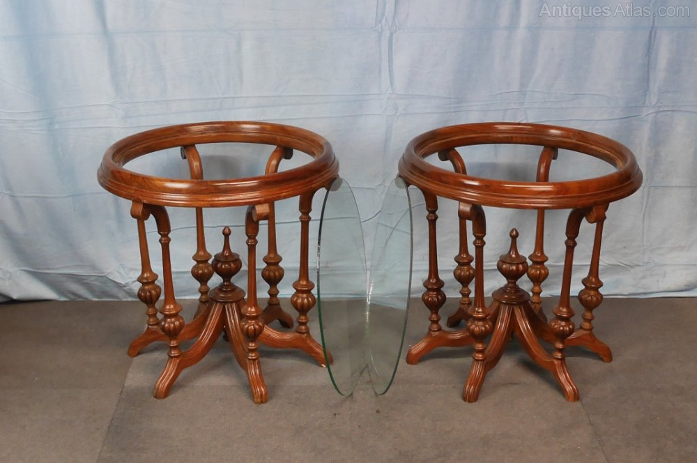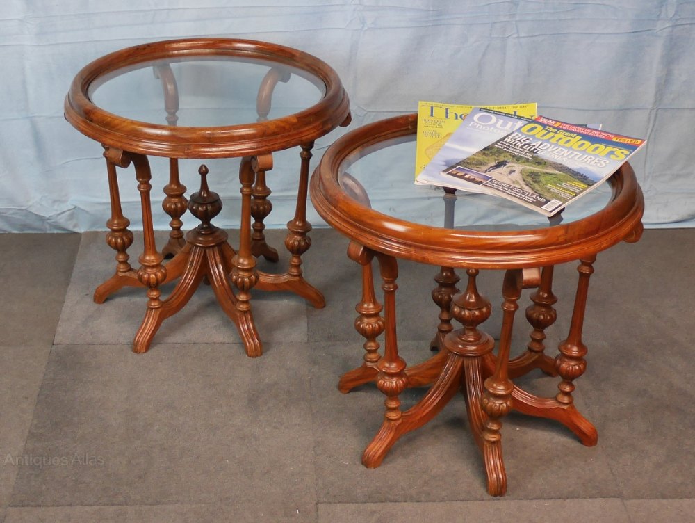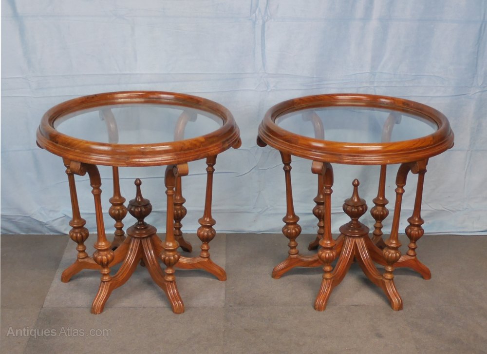 A pair of excellent, heavy quality late Victorian, circular, walnut, coffee antique tables. These have very decorative carved and turned bases with inset glass tops, which are removable if required, see picture. They are in very good, strong, robust condition with a lovely old, original, polished surface. Sizes: 21 ½ “(55cms) diameter, 19”(49cms) high. Date circa 1880.