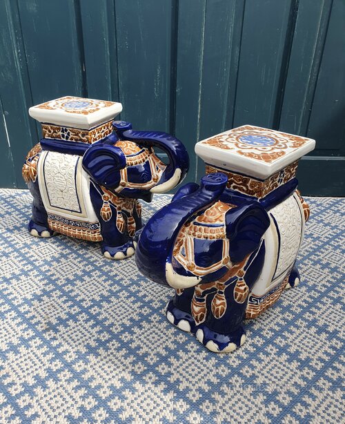 A beautiful vintage pair of glazed ceramic elephant plant stands. This lovely large pair of elephants are mainly decorated in a bright cobalt/Bristol blue, Ivory and desert brown. They are structurally very strong and can be used as plant stands or as garden seats.