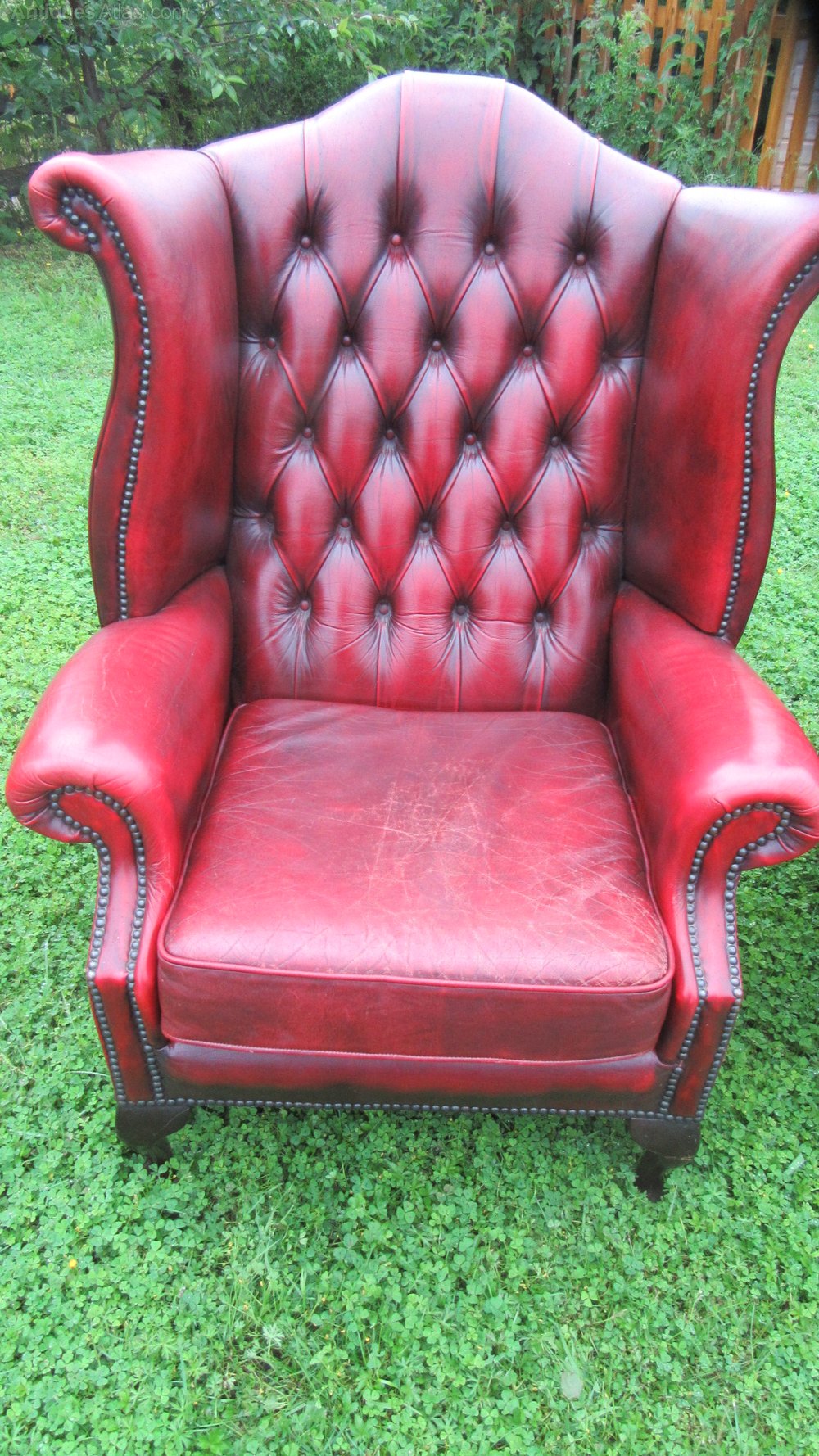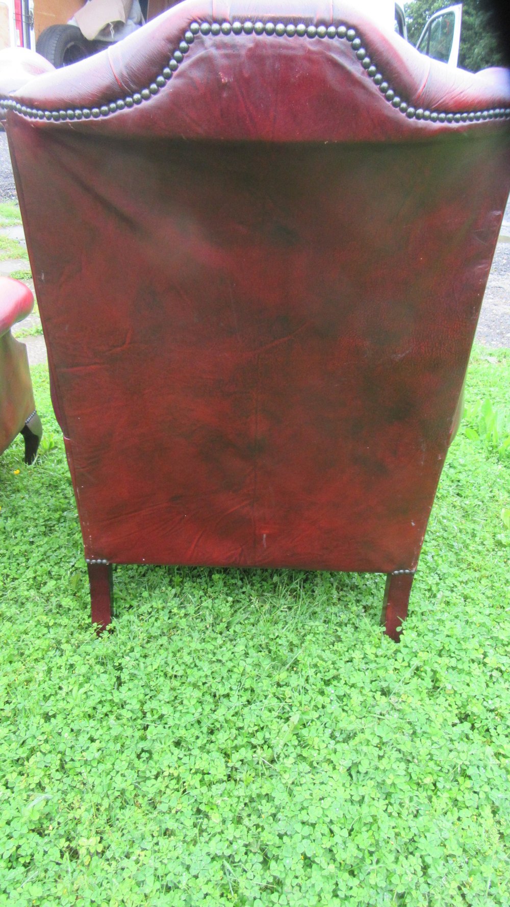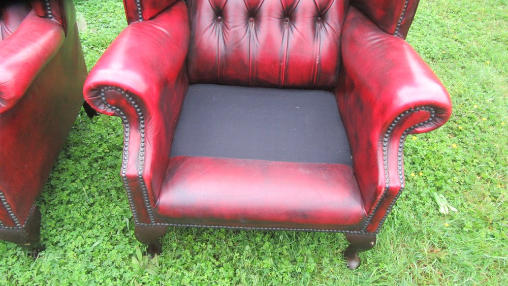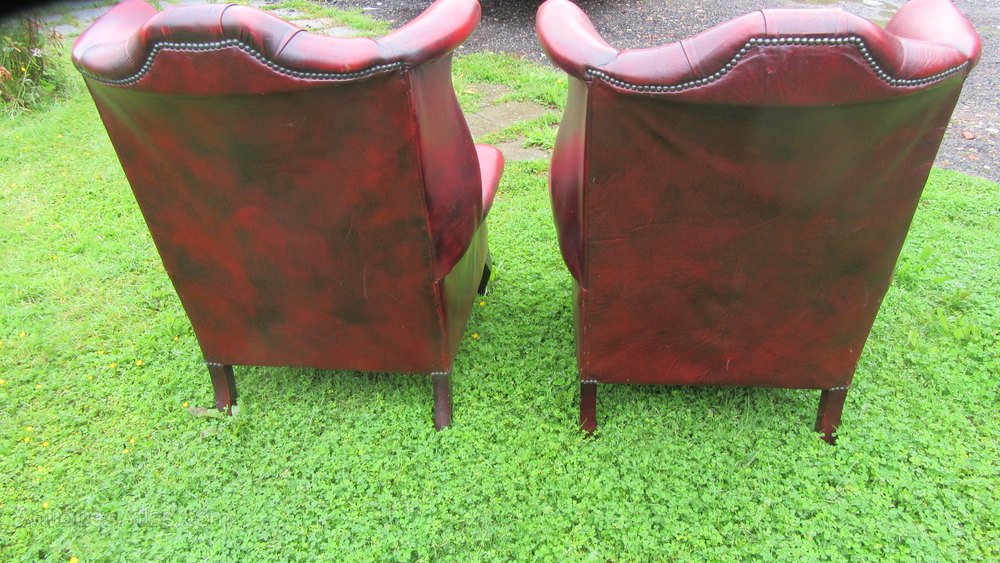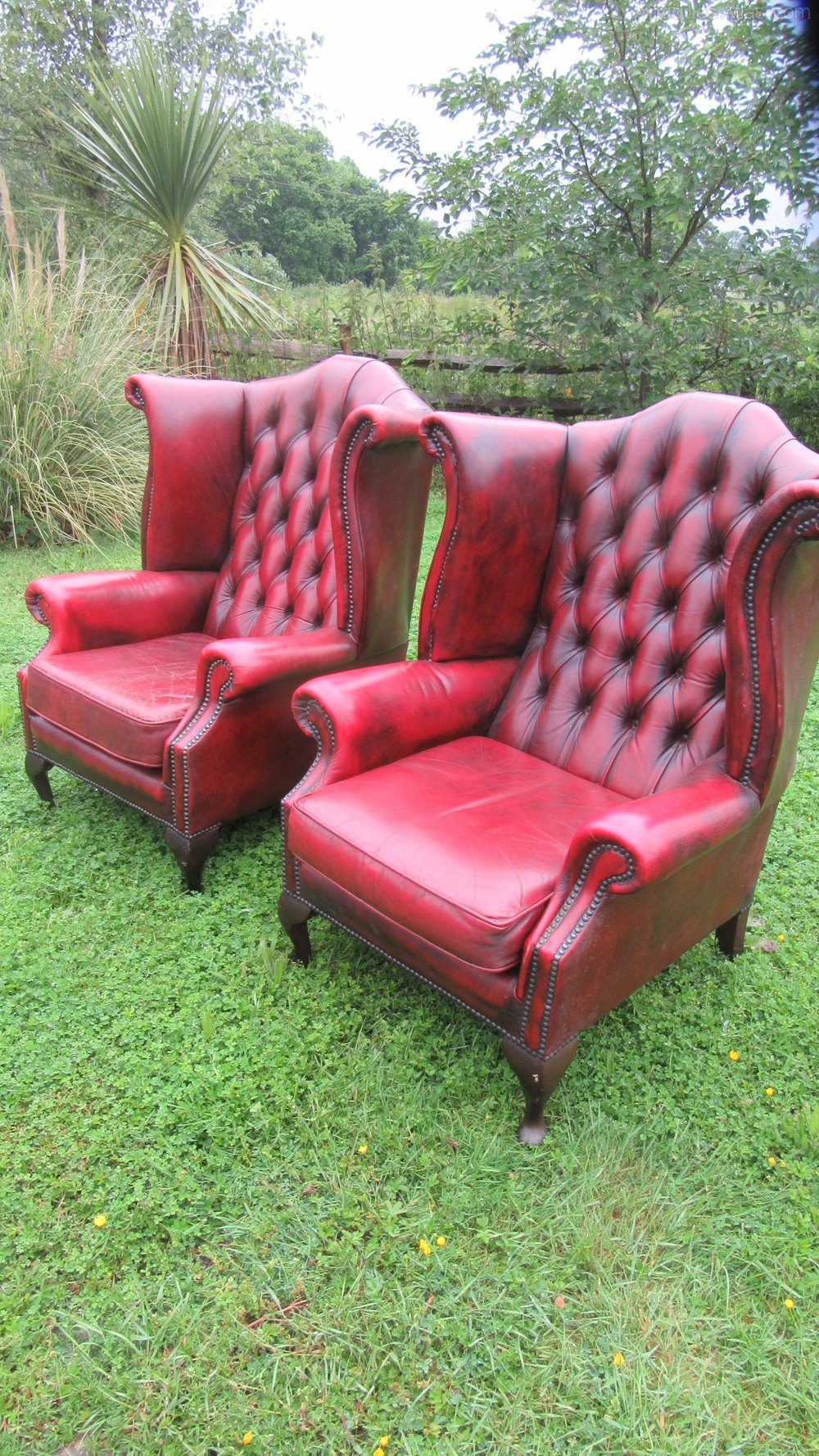 Pair of Vintage Deep Buttoned Leather Wing Armchairs with removable cushions 114 cm high 65 cm wide 88 cm deep