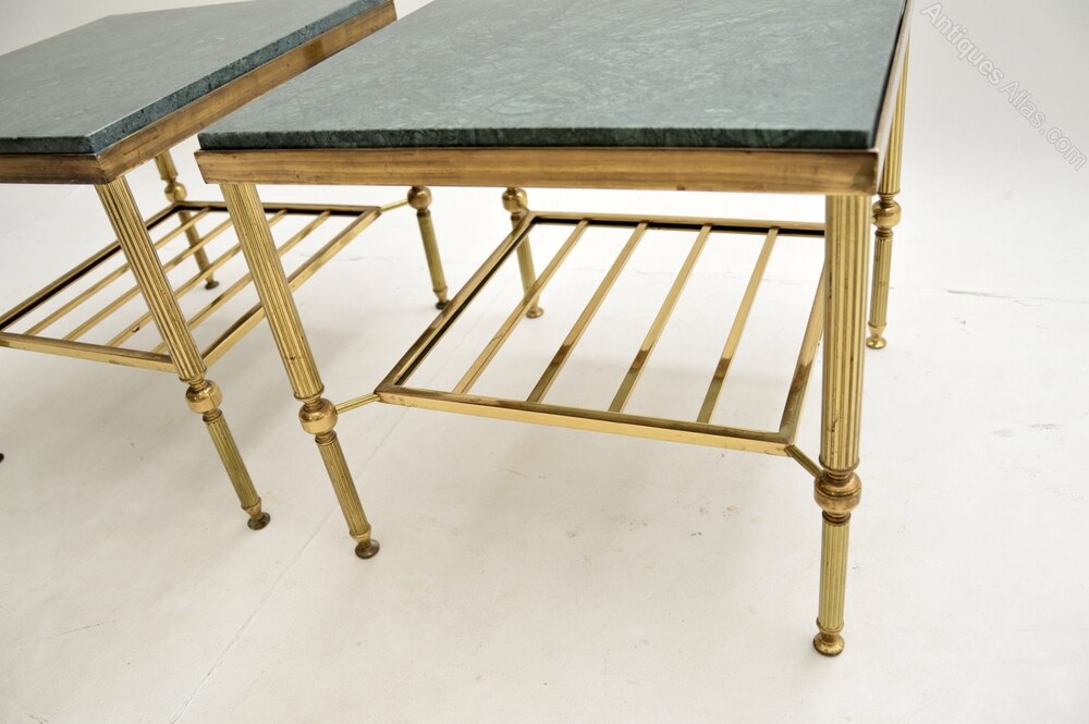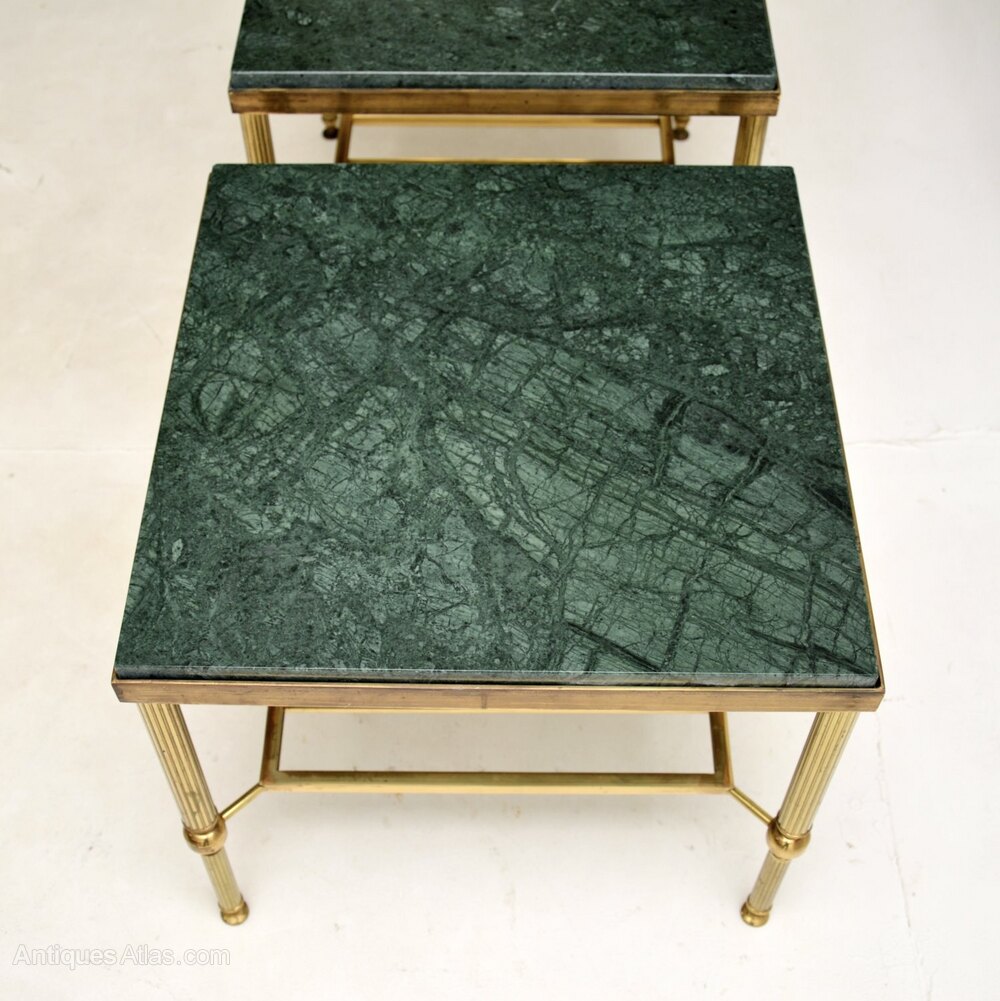 The brass has acquired a gorgeous patina over the years, we have had the green marble tops newly cut especially for these. The condition is excellent, with only some extremely minor wear to the frames.