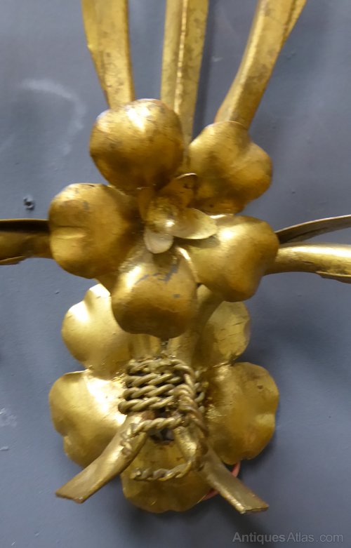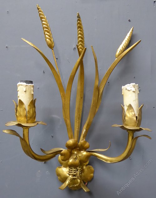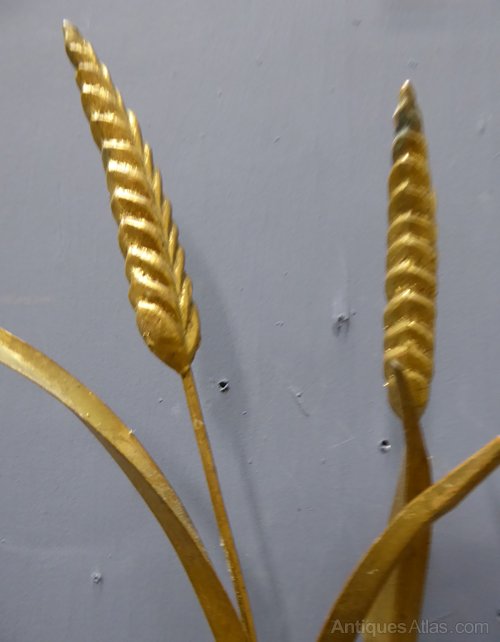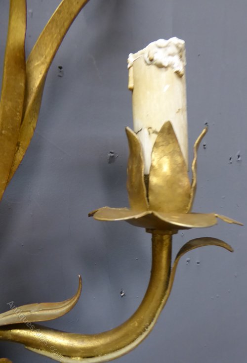 Ref 6953 - Pair of two arm vintage French gilt painted metal wheatsheaf wall lights. Original wiring needs checking. Circa 1960.