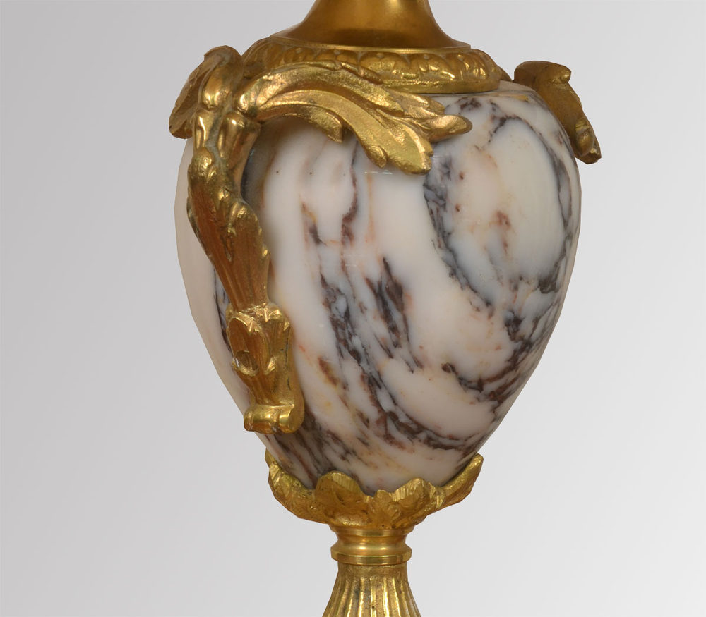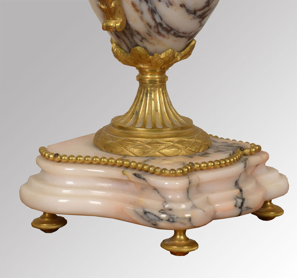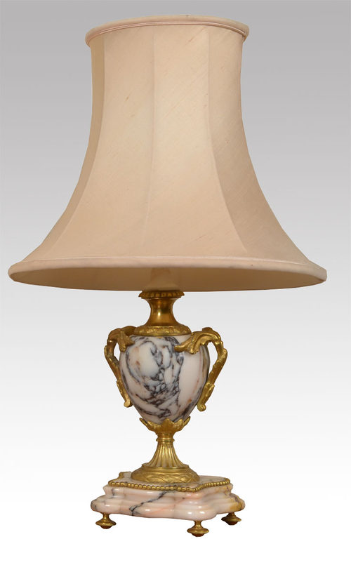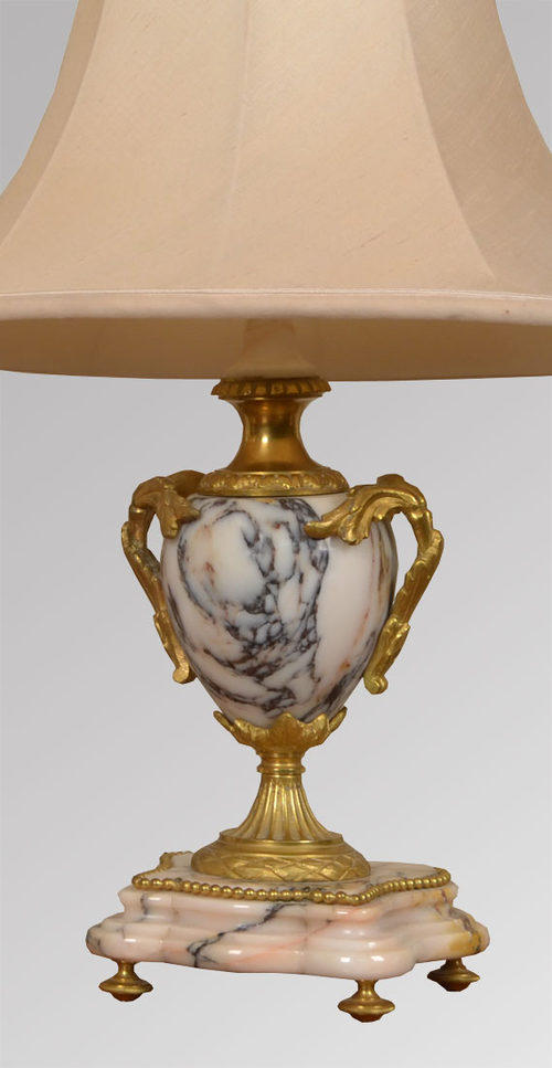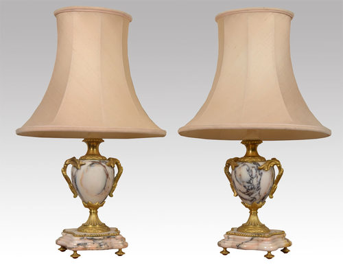 Pair of early 20th century Continental variegated white marble and ormolu mounted table lamps, of ovoid outline, with ormolu mounts, raised on spreading base and gilt metal feet, with pink shades