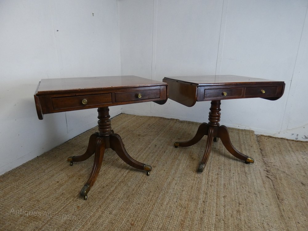 The tables have two drawers to the front as well as faux drawers to the back, so can sit in the centre of a room. Both with turned mahogany stems, standing on four splayed legs with brass toes and castors.