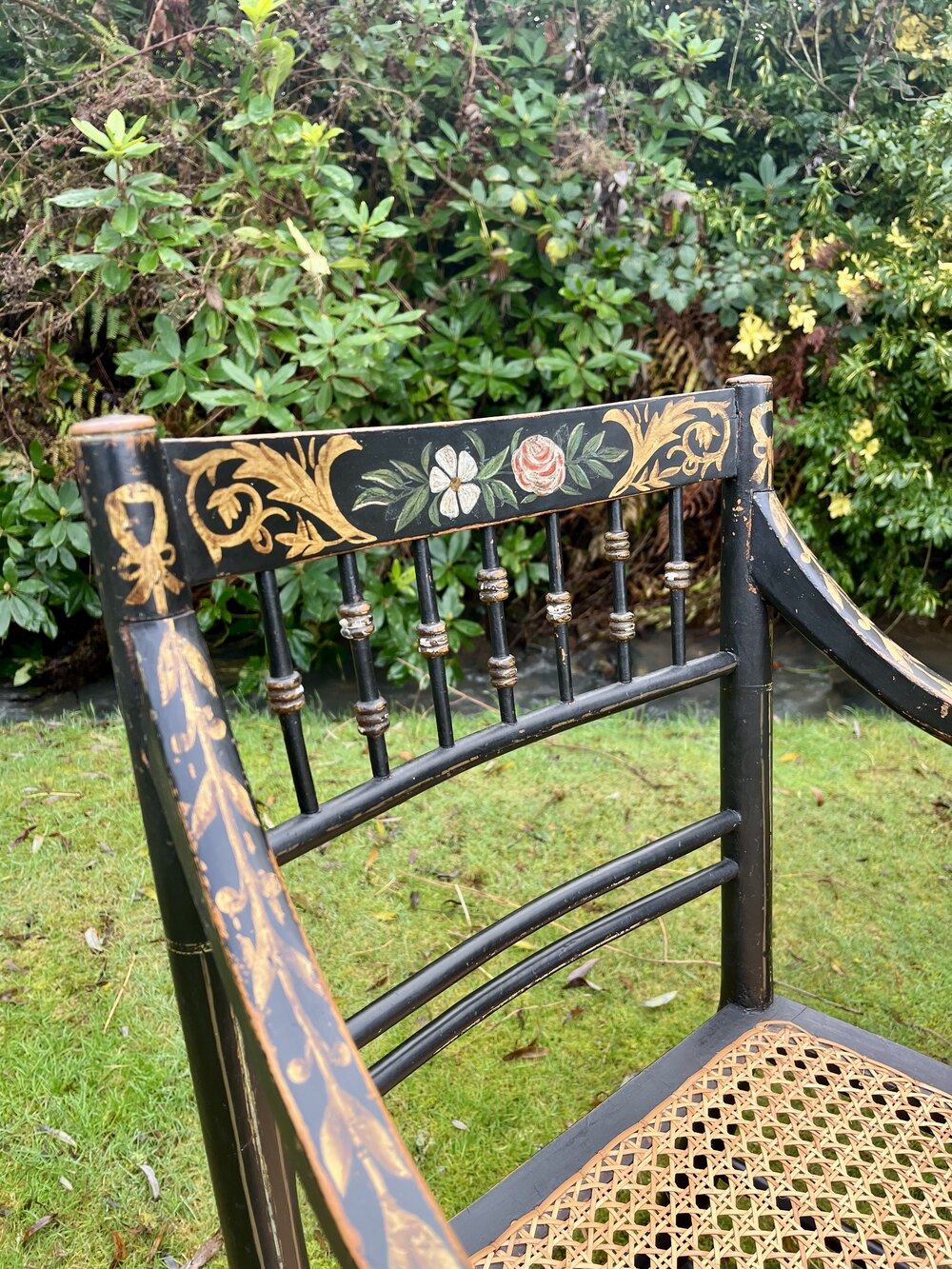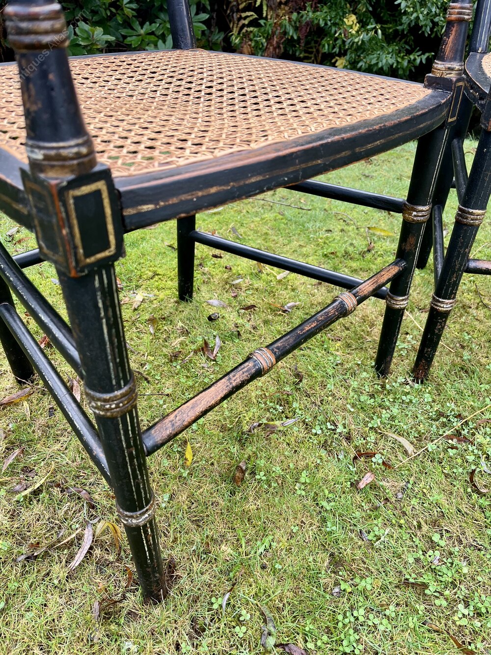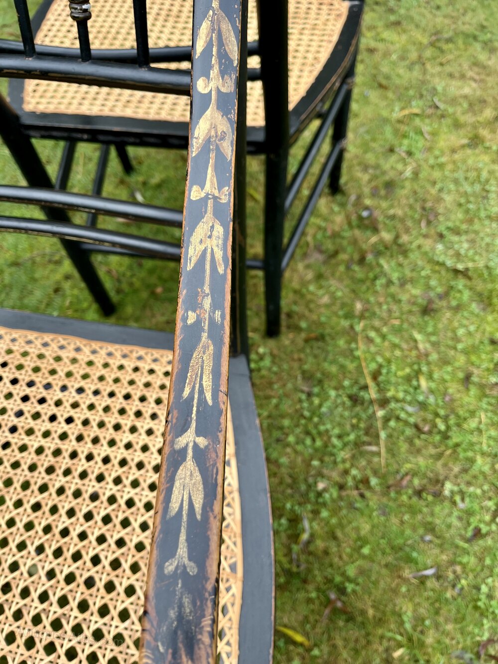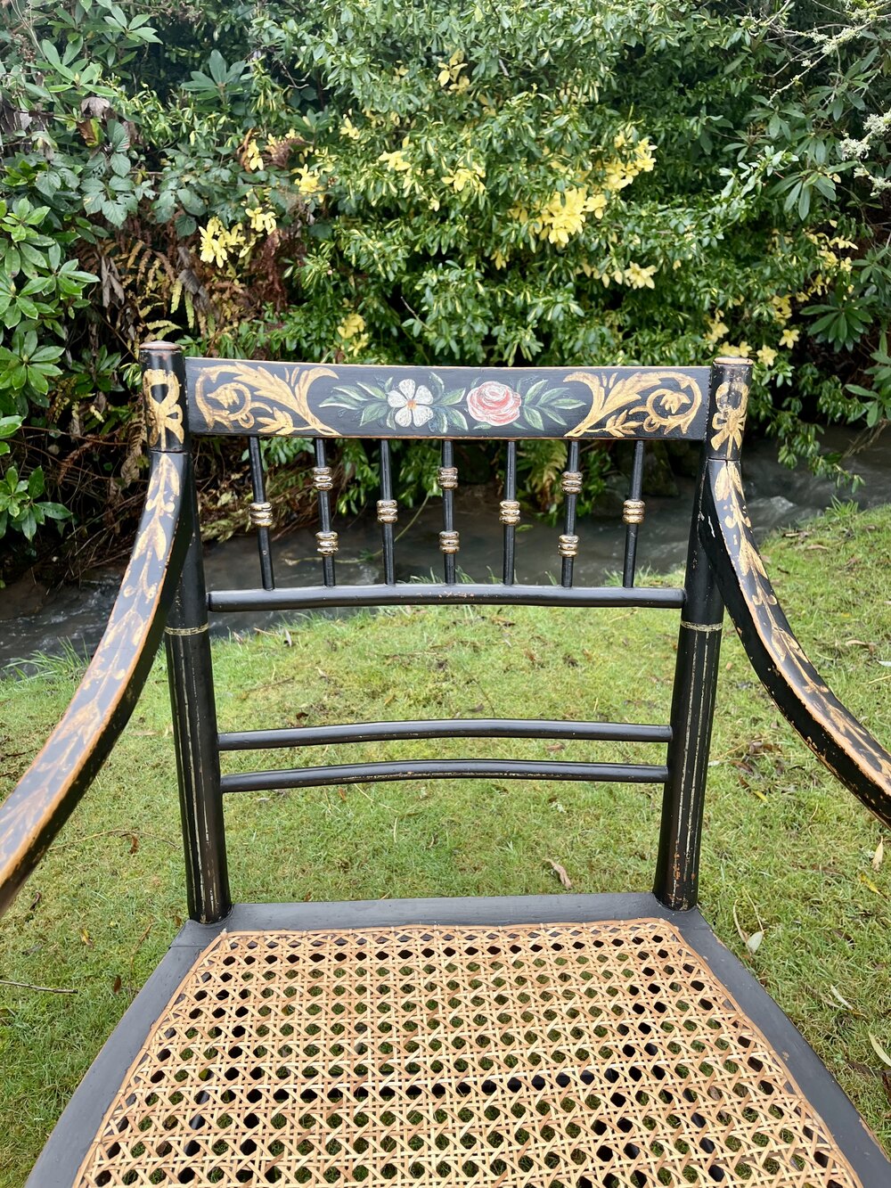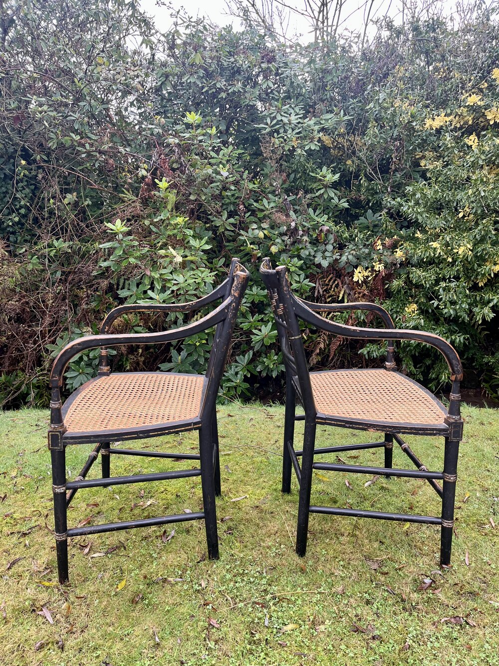 Lovely pair of black laquered regency armchairs with original paint and parcel gilt decoration with caned seats both in original condition with natural wear to paint. Please get in touch if you require any further details.