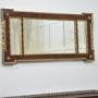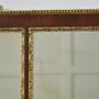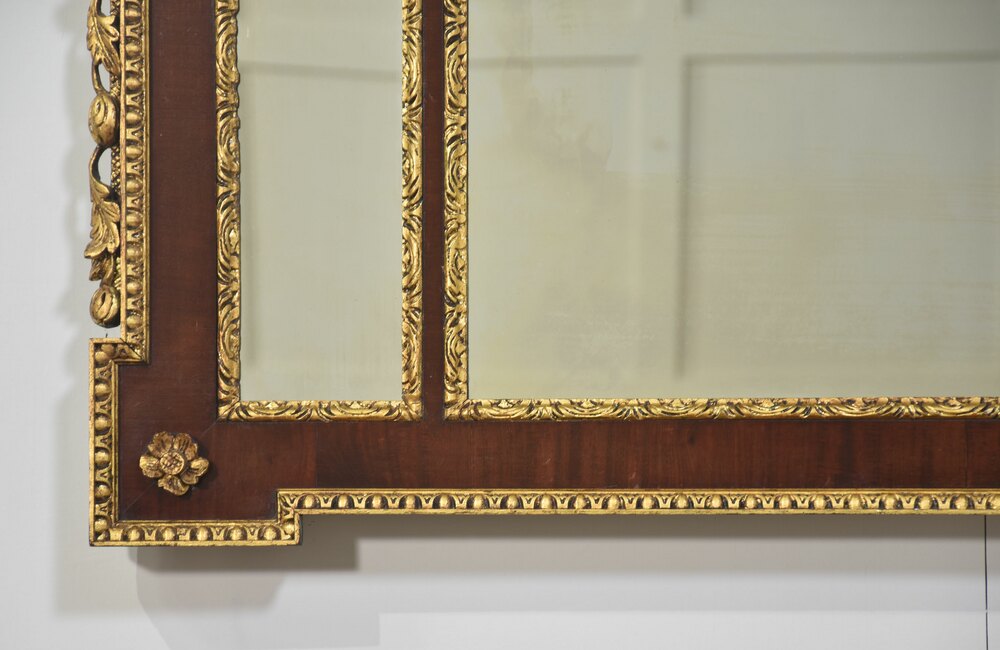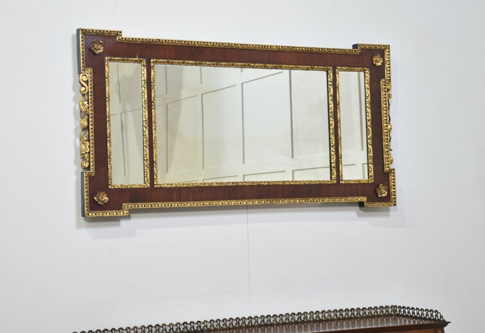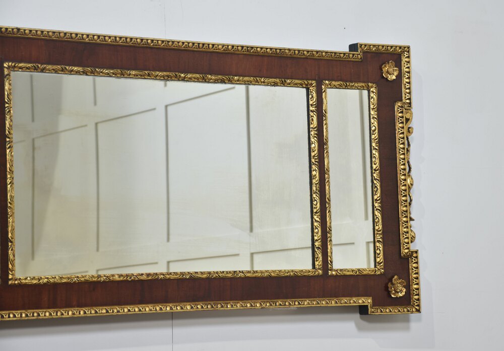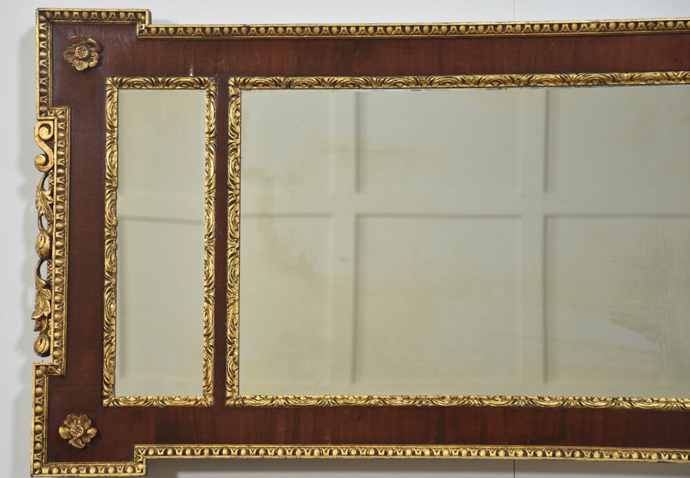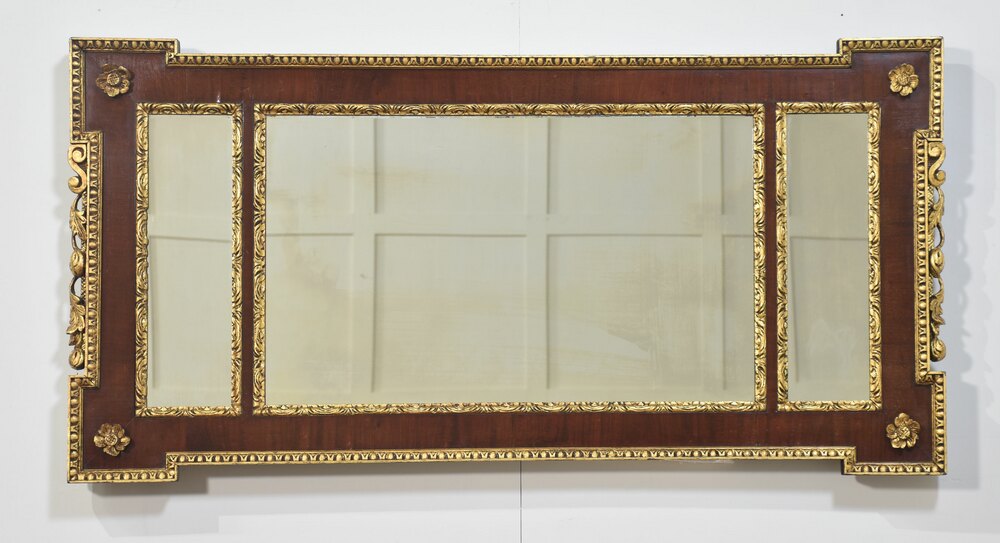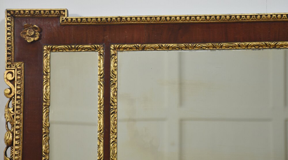 Parcel-gilt mahogany shaped rectangular three-plate mirror, the frame bordered overall with egg-and-dart moulding, the mirror plates framed with stylised foliate borders, each hipped angle applied with a flowerhead, the sides applied with S-scrolls, fruit and leaves.