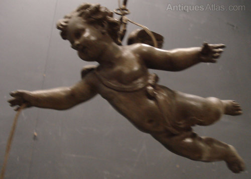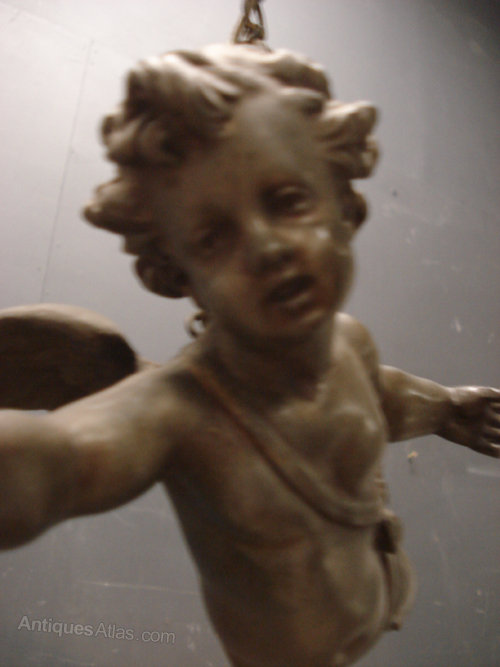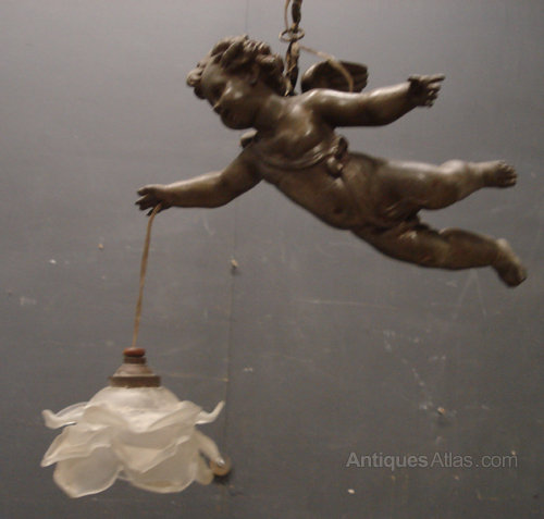 Ref 4046 - Patinated speltre cherub light. Original wiring needs checking. Circa 1920.