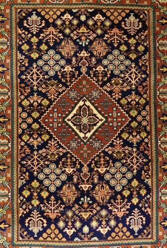 A traditionally made Persian wool rug, displaying a richly patterned field centred by a geometric medallion and surrounded by intricate stylised floral and tribal motifs. The deep indigo ground is complemented by warm terracotta, soft green and ivory tones, creating a well-balanced and decorative palette.