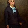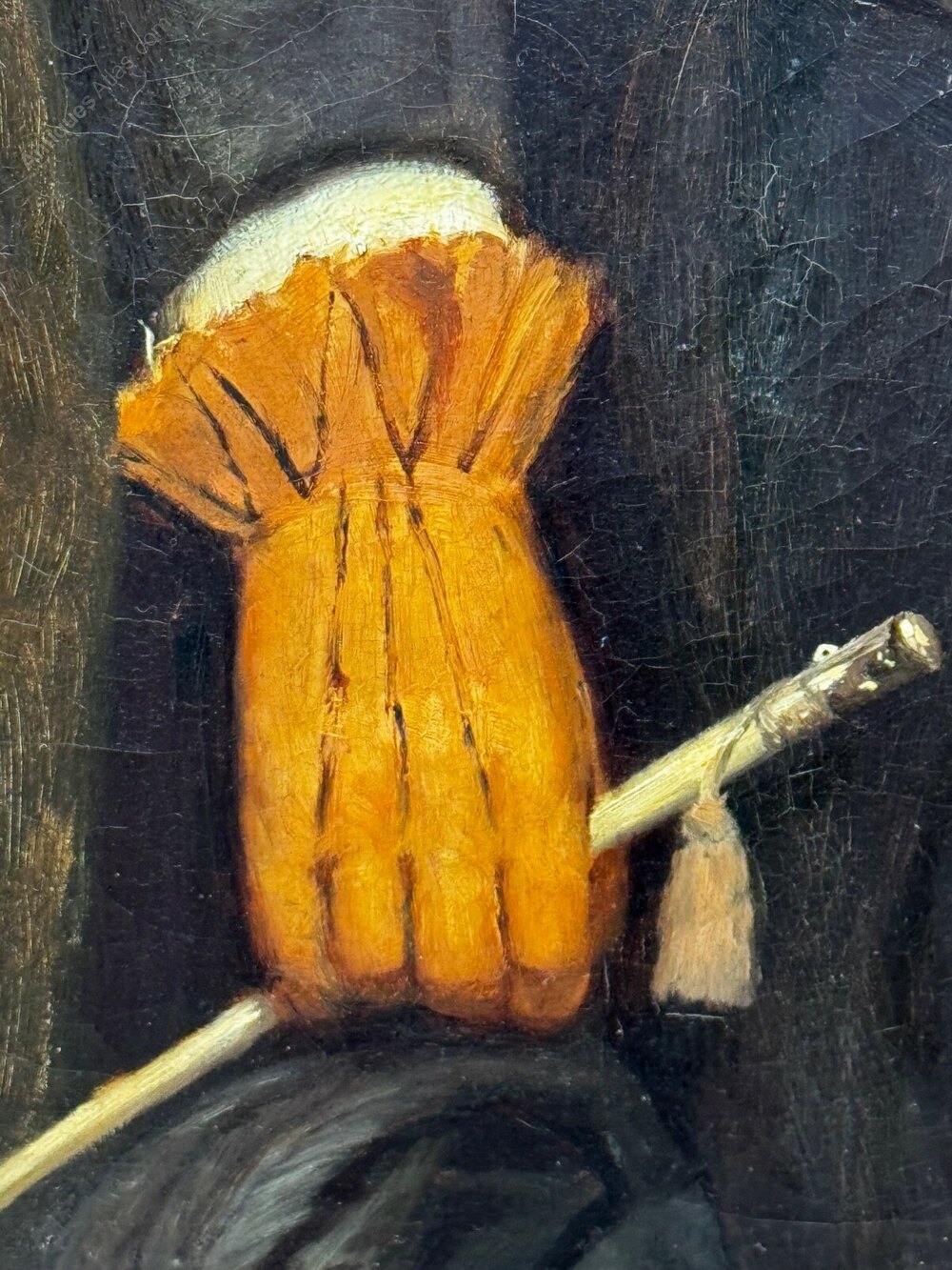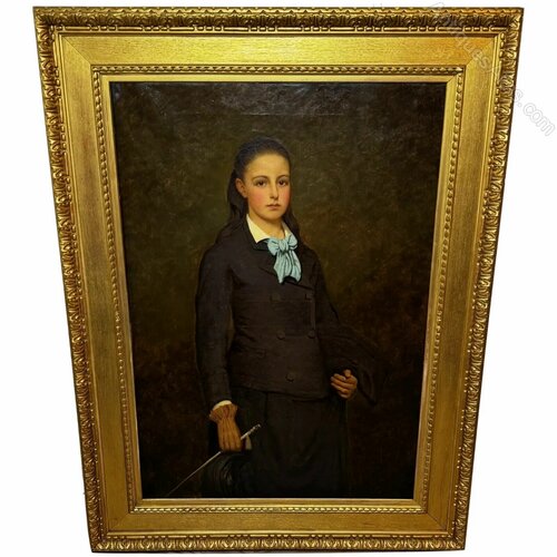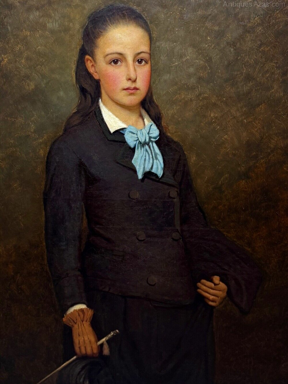 A magnificent example of Victorian portraiture, this oil on canvas depicts a young lady of distinction poised with quiet authority. Her attire — a fitted black riding jacket, white blouse, and turquoise cravat — embodies the fashionable refinement of the 1870s. The golden-brown gloves introduce warmth and contrast against the cool tones of her clothing, while her serene gaze conveys both discipline and grace. The artist’s handling of surface and texture demonstrates the technical sophistication characteristic of high academic painting of the period.