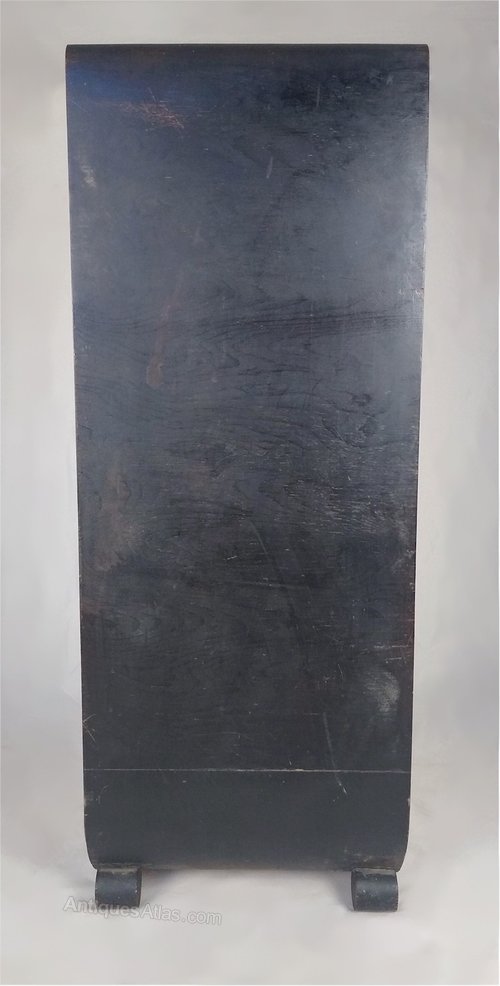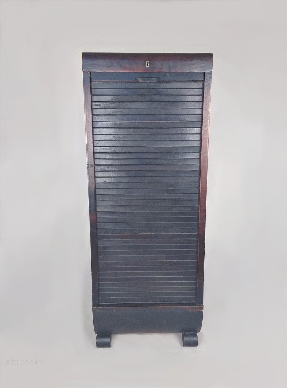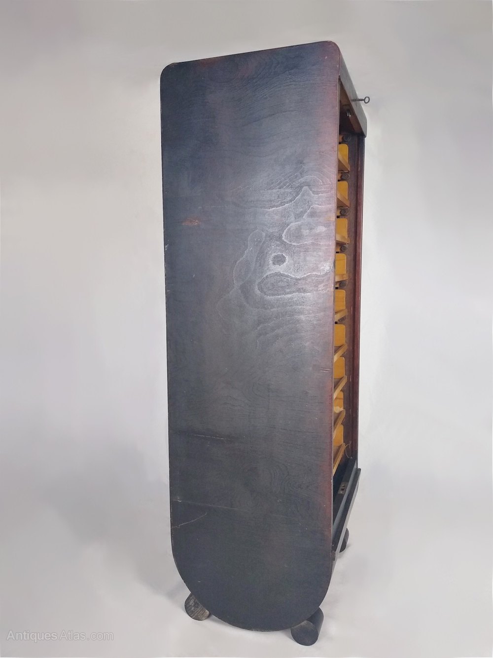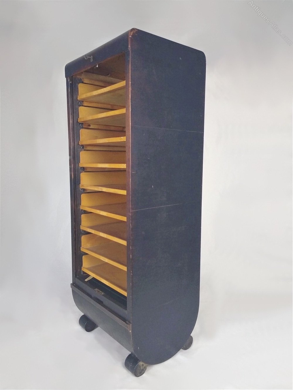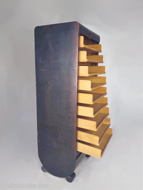 Pretty , post war , French filing cabinet in bent ply , very much in the art deco style ,with curved edges and roller shutter . Featuring 9 smooth running drawers and working lock and key , it harks back to the lack of materials immediately after the 2nd World War .One or two spots of historic worm on two feet , treated anyway and filled .