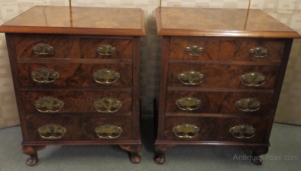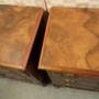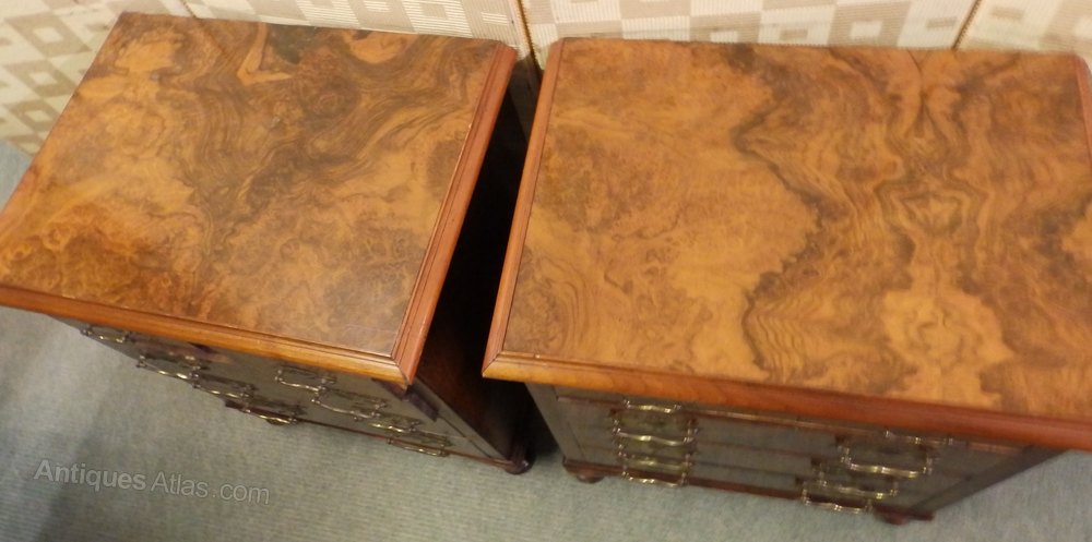 no-688-Pair of 1960s burr/walnut Bed-Side Chests in Antique Style (small nick below bottom drawer of one cabinet ) other wise in very good condition