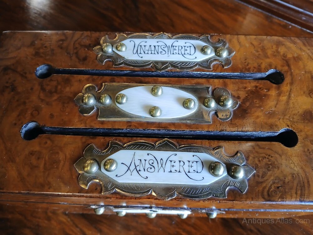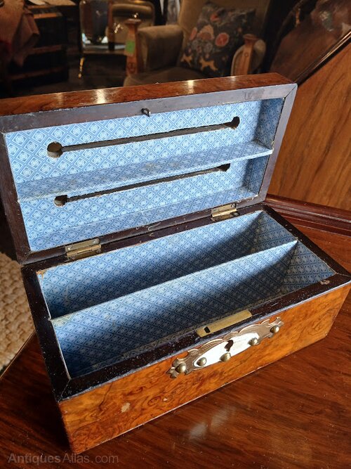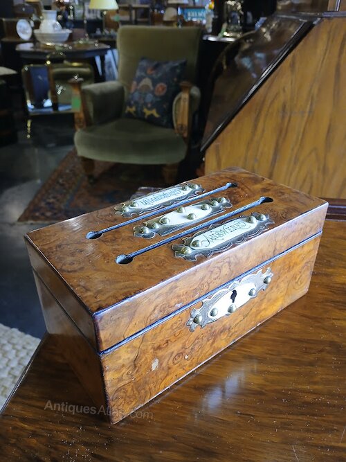 Delightful English Edwardian burr walnut stationary box. In nice fine condition throughout , with a good colour that is further enhanced by retaining it's original tablets to the lid and its carefully made fitted interior.