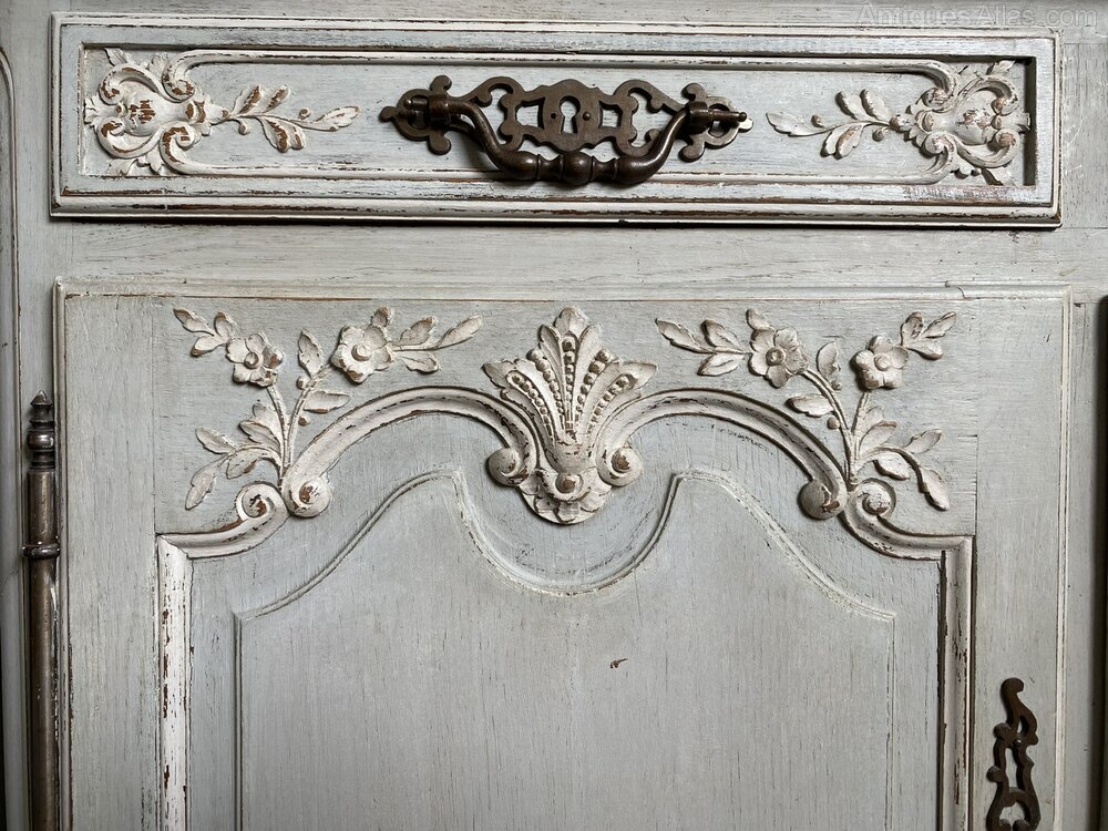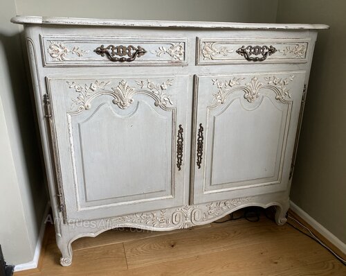 A very pretty French original painted Cupboard or Cabinet. Having 2 doors opening to reveal a single shelf inside and 2 drawers over, all fittwd with original hardware. Lovely carved decoration to the front and finished in its original paint finish that is slightly worn, in overall excellent original condition for the home.