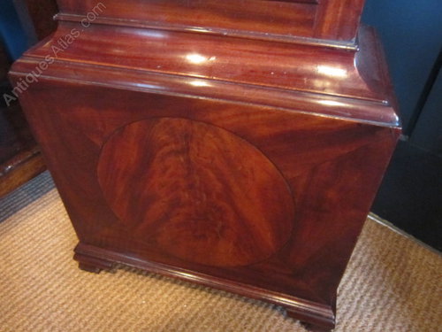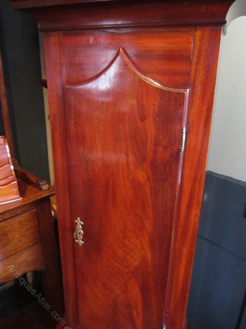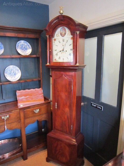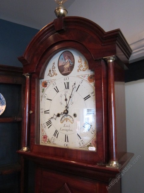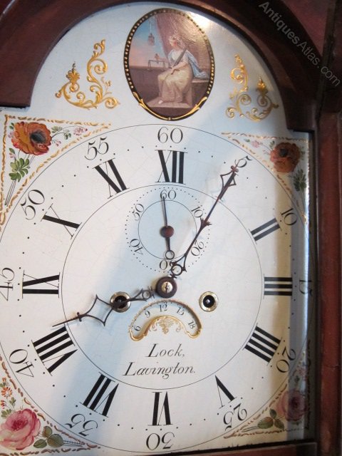 A Pretty Late Georgian mahogany cased 8 Day longcase clock made by Lock of Lavington(Wiltshire).c.1800.Arched top painted dial with date aperture and seconds count.Pretty flower blossoms to the corners and portrait to the top arch.Strikes on a bell to the hour.Figured mahogany case with arched top hood and turned pillars.Small proportions only 79"high including the finial top.Fully overhauled.Superb colour and patina.
