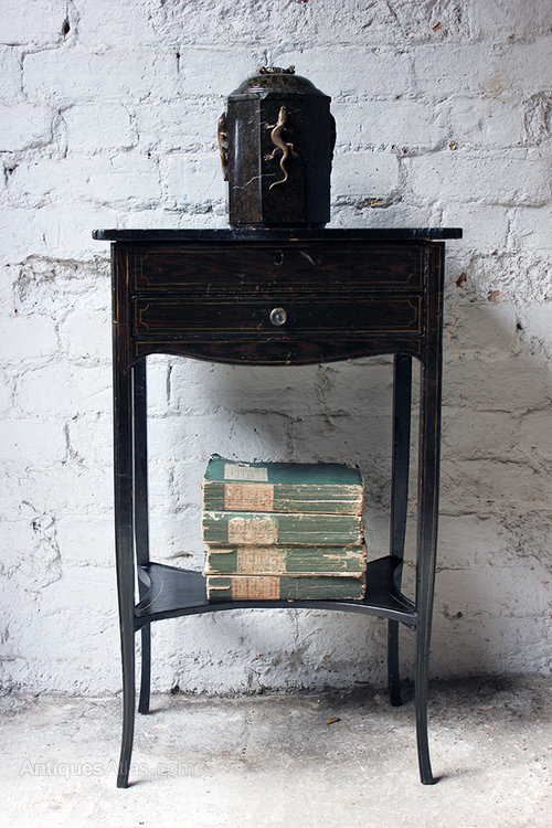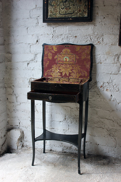 The black jappaned side table displaying typical Regency elegance with splayed legs, lower shelf, drawer, and shaped hinged lid opening to reveal a silk lined compartmentalized interior, the whole having simulated cross-banding survives from the first quarter of the nineteenth century.