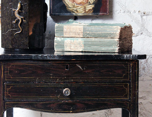 In the Regency period one of the uses of japanning was for ornamental decoration and we see this typically employed here with the charming simulated cross-banding (in this case the cross-banding on a more expensive Regency piece of this type would probably have been brass). This type of work was used on more mid-range pieces with a real saving made on the materials and labour used to make real inlay.