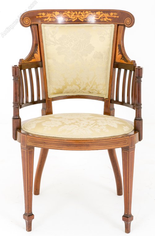 This chair has square tapered legs with boxwood inlaid lines.