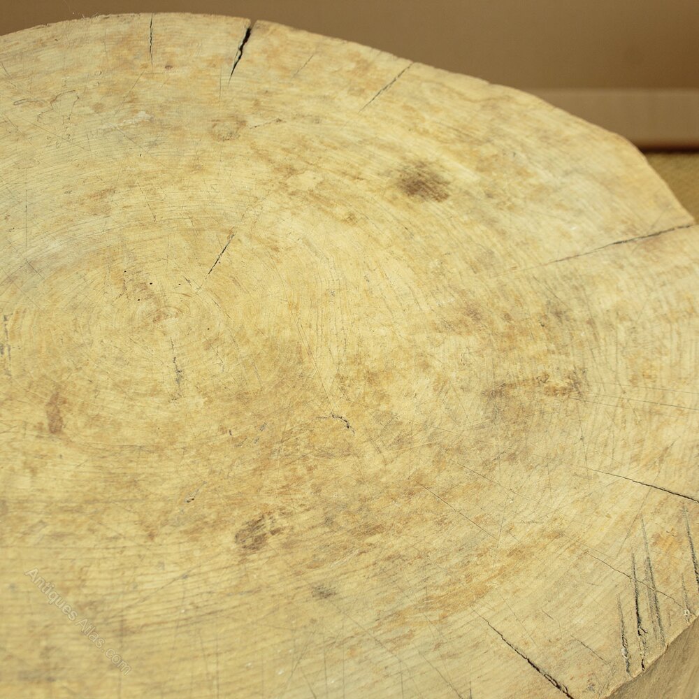 Primitive vernacular French kitchen chopping block on tripod legs. Ideal as a rustic side table. Made from an 10" thick section of elm trunk, the end grain providing maximum strength. Raised on three simple turned legs in mixed timbers, splayed for stability. Presented as found, left dry and unwaxed with old cut marks to the top. Solid and sturdy.