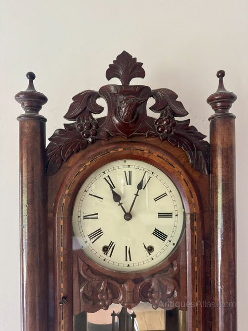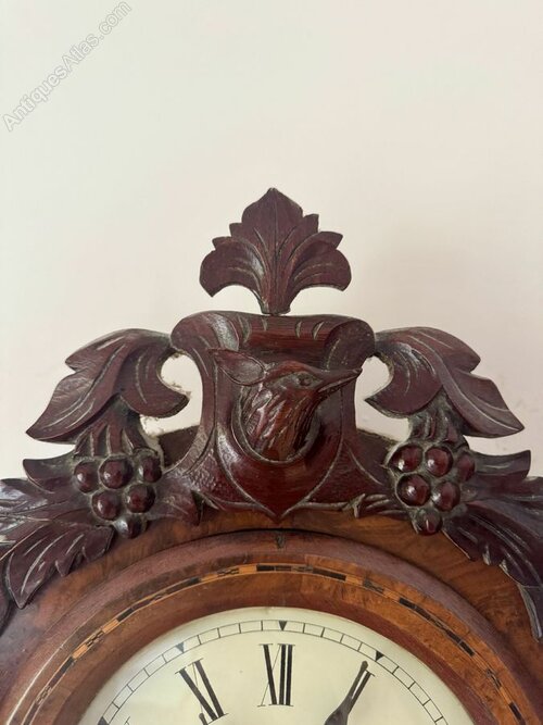 Quality 19th Century drop dial walnut wall clock, having a quality 19th century drop dial wall clock with a quality walnut case featuring to the top of the case a carved deer's head surrounded by fruiting vines and the original carved leaf finale above, flanked by turned columns with a single glazed door to the centre casing an 8 inch dial with black Roman numerals and black spade hands, having a quality eight day movement striking on a bell, with a mirror back and exposed pendulum above a quality shaped base. Come with a winding keys.