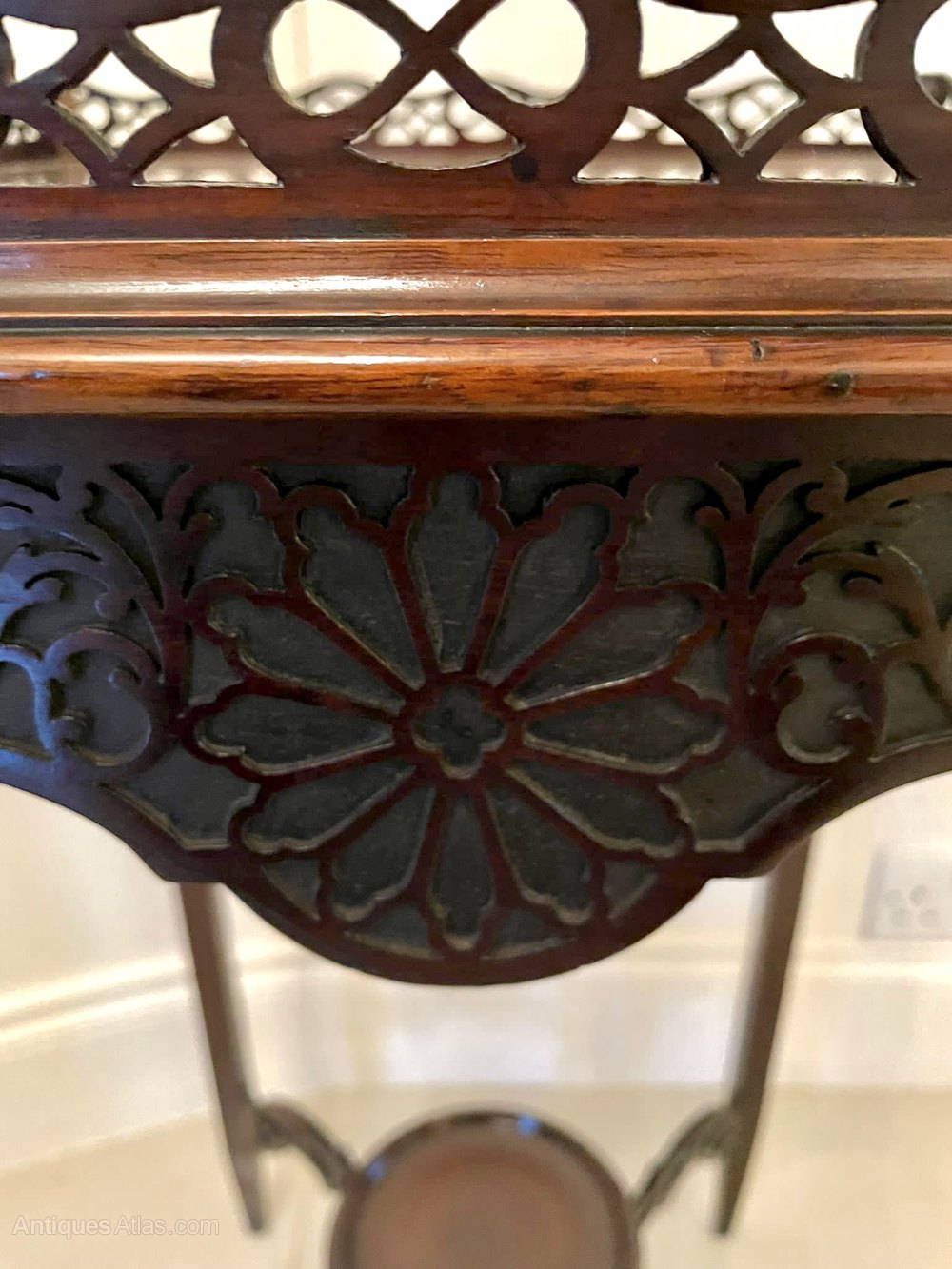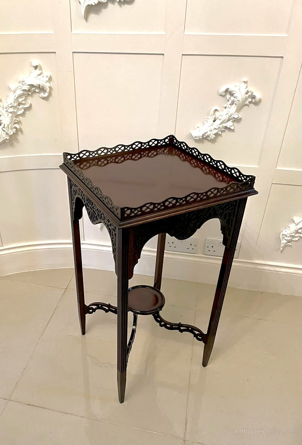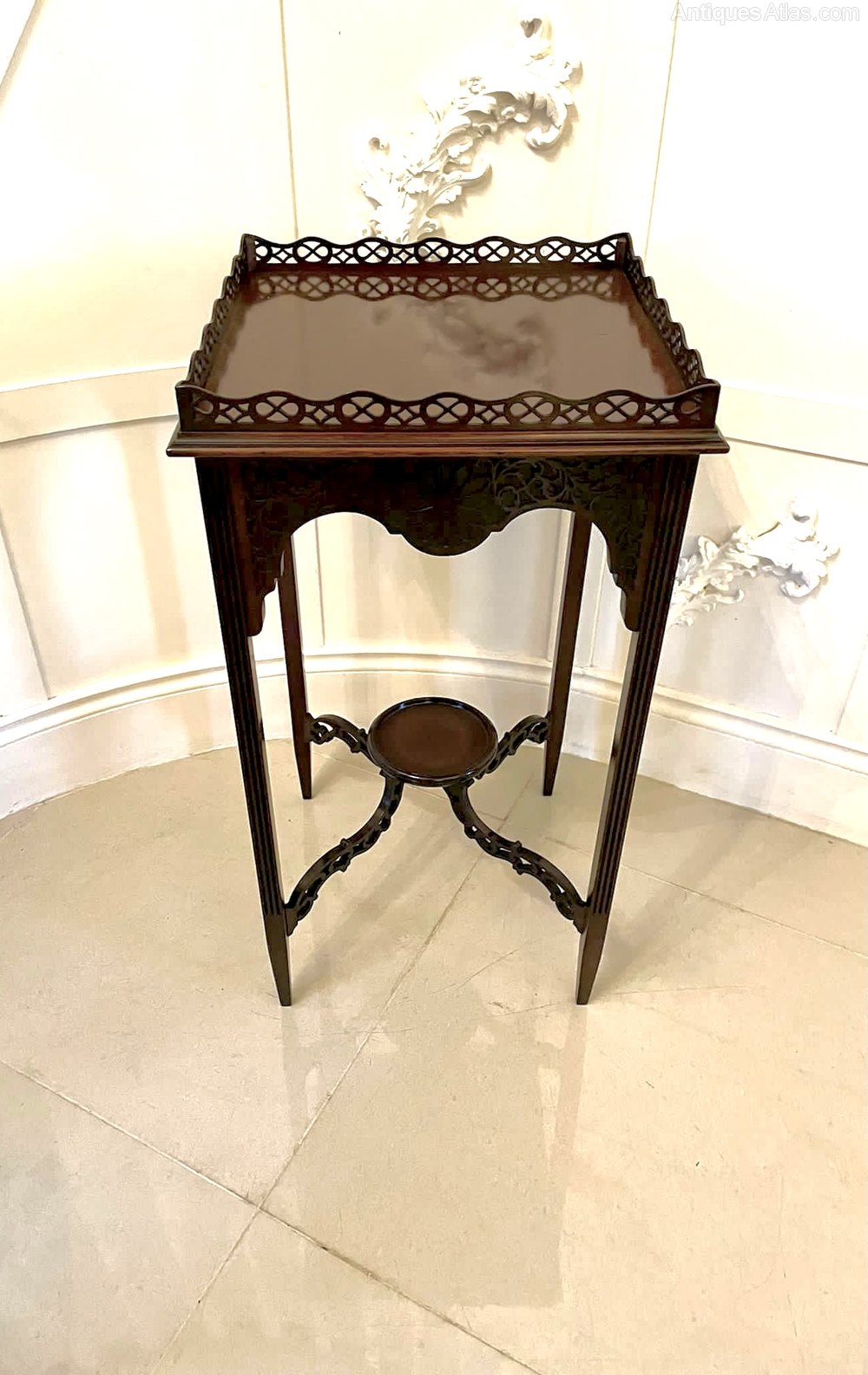 Quality antique Victorian carved mahogany lamp table having a very attractive quality pierced fretwork gallery and mahogany top with a moulded edge and shaped mahogany frieze. It stands on elegant square mahogany tapering legs united by shaped carved pierced stretchers with a round moulded edge undertier.